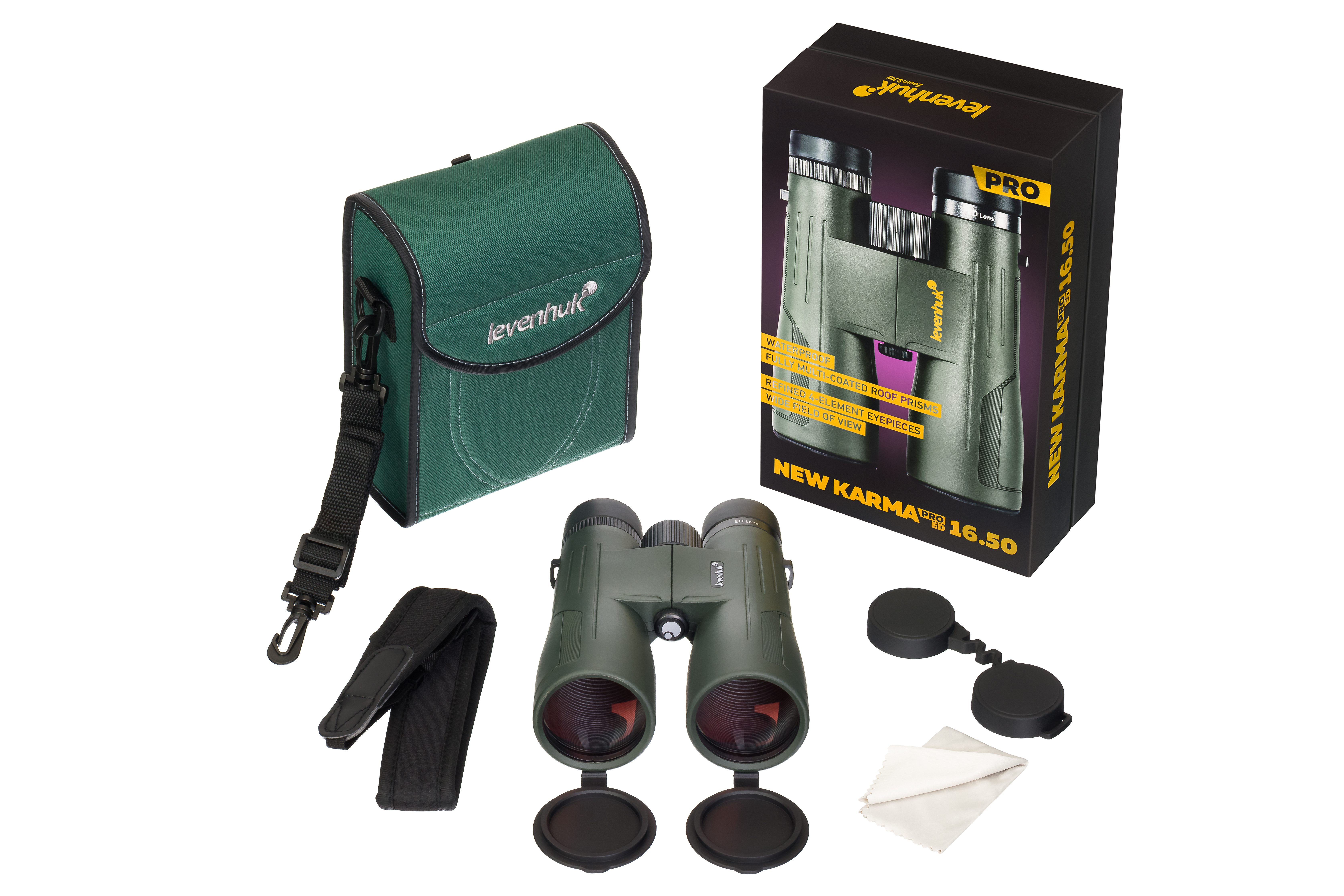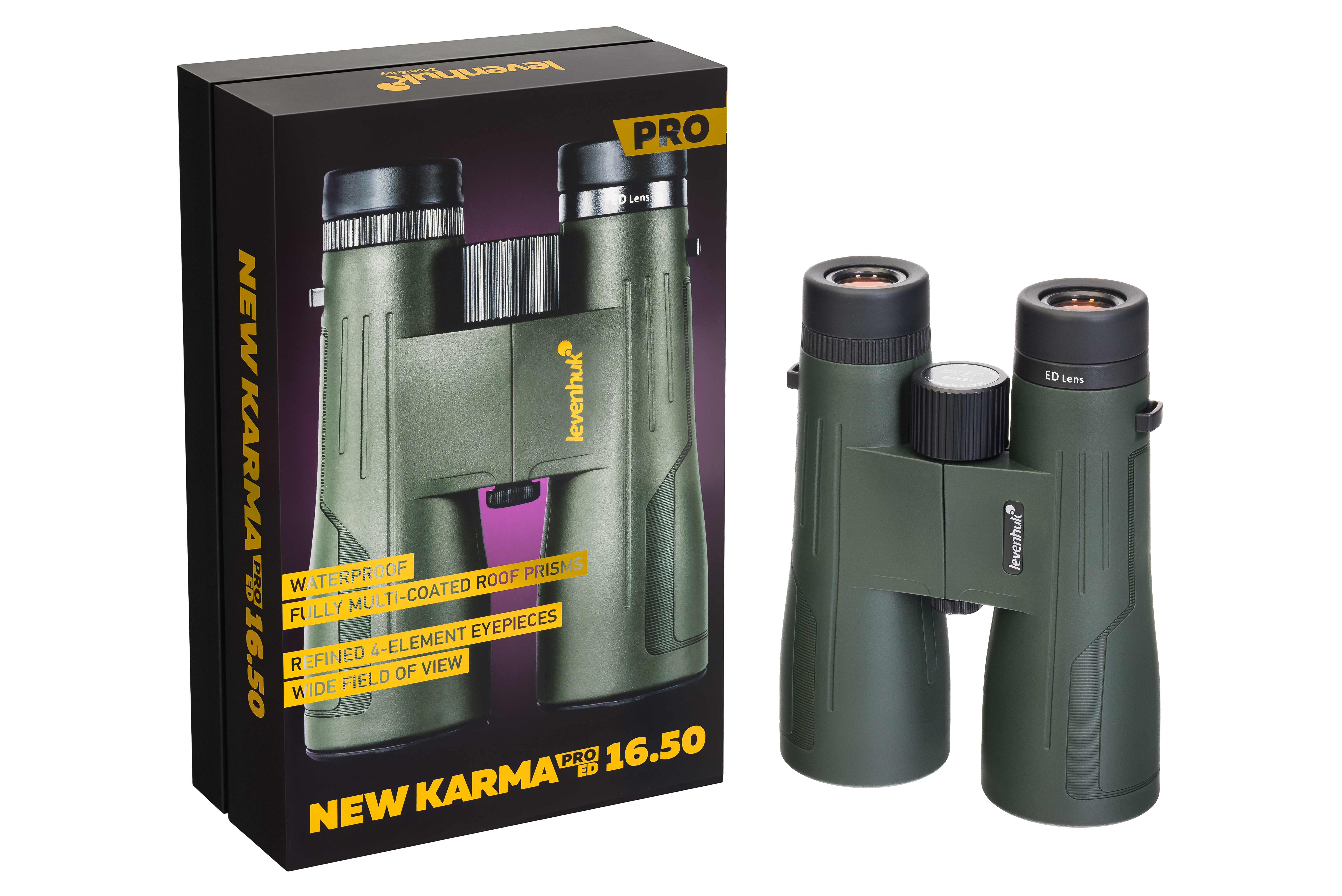 Levenhuk New Karma PRO ED 16x50 – настоящая находка для тех, кто планирует использовать прибор в сложных климатических условиях на природе. Корпус бинокля защищен от воздействия пыли, воды, песка и грязи по стандарту IP67, стандарт не причиняет ему вреда даже при падении в большой водоем (на короткое время и на высоте до 1 метра). Внутри корпуса дополняют азотом, а это значит, что даже при значительных скачках температуры или уровня влажности окружающей среды на линзах прибор не будет образовываться конденсат. Несмотря на значительную оптическую силу и большую апертуру объектива, бинокль сохраняет компактные размеры и удобную для транспортировки форму корпуса – все это благодаря использованным в оптической схеме крыша-призмам.