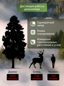 В бинокле есть встроенный лазерный дальномер. Его показания выводятся на внутренний экран в красном цвете. Дисплей автоматически подстраивает светочувствительность и яркость отображения. С помощью дальномера можно определить прямое расстояние, горизонтальное расстояние и углы. Можно выбрать режим одиночного измерения или непрерывного сканирования. Нажатием на кнопку устанавливаются единицы измерения: метры или ярды. Измерить расстояние до объекта высотой с дерево можно на удалении до 3000 м, оленя – до 1100 м, человека – до 700 м.