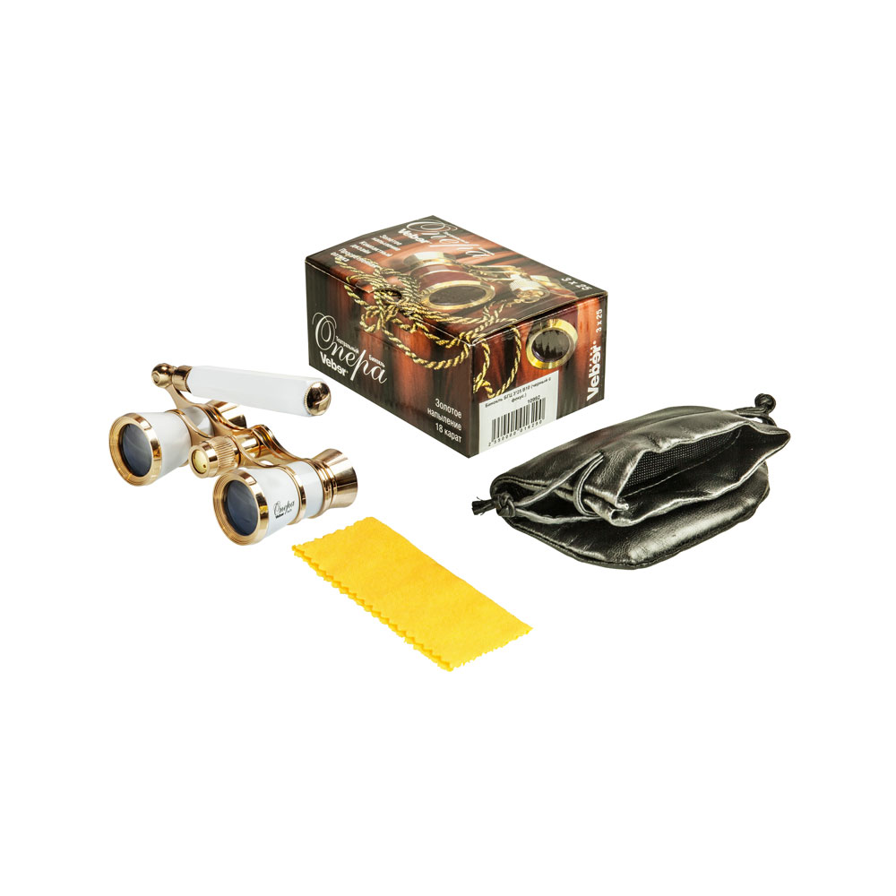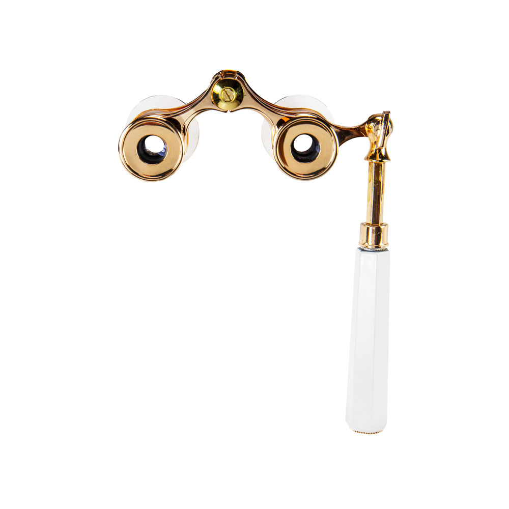 Классическая галилеевская оптическая схема с центральной внутренней фокусировкой, заключенная в белый лакированный корпус с напылением «золото». Трехкратное увеличение и широкое поле зрения позволят вам насладиться представлением даже с галерки.