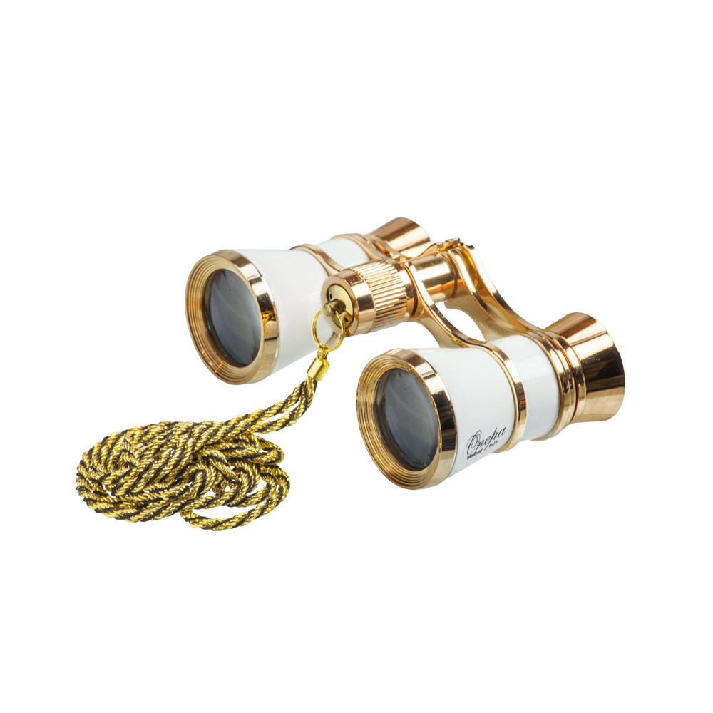 Классическая галилеевская оптическая схема с центральной внутренней фокусировкой, заключенная в белый лакированный корпус с напылением «золото». Трехкратное увеличение и широкое поле зрения позволят вам насладиться представлением даже с галерки.