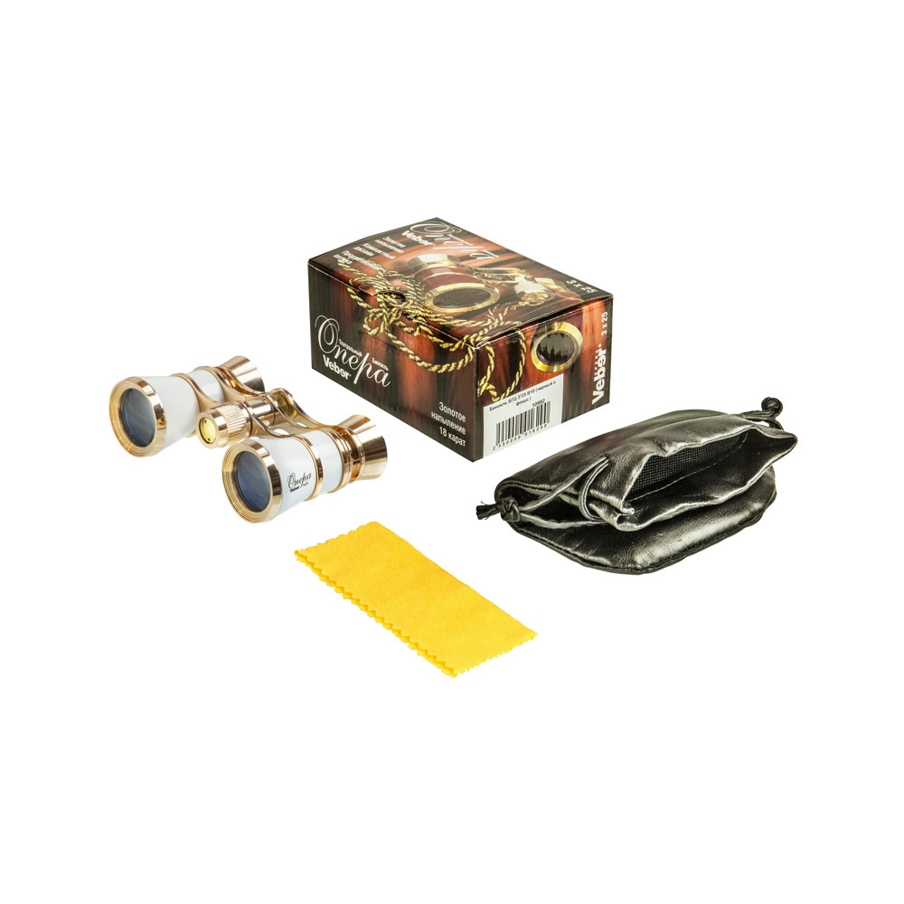 Классическая галилеевская оптическая схема с центральной внутренней фокусировкой, заключенная в белый лакированный корпус с напылением «золото». Трехкратное увеличение и широкое поле зрения позволят вам насладиться представлением даже с галерки.