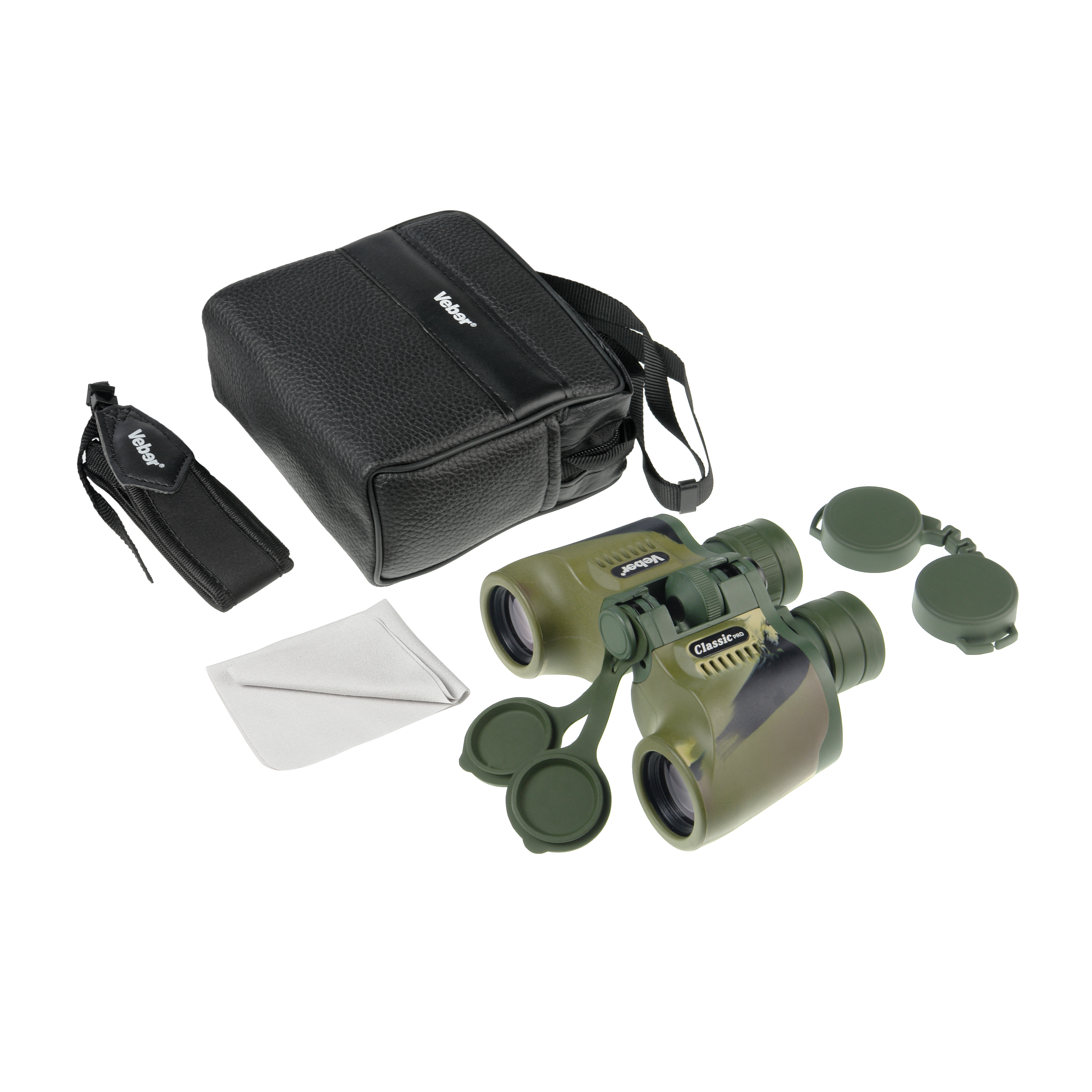 Veber Classic PRO 7x32 VR – камуфлированный бинокль с центральной фокусировкой в пластиковом корпусе с отделкой резиной (VR). Корпус бинокля выполнен из пластика, но наиболее ответственные подвижные детали – из металла.