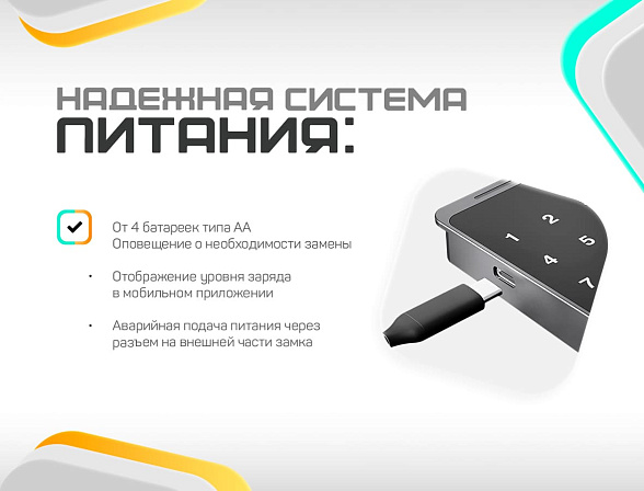 Замок работает от 4 пальчиковых батареек типа AA. Срок службы, которых более 12 месяцев.
