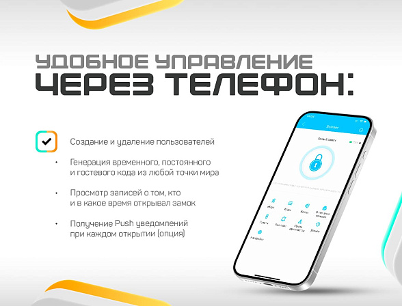 Мы рекомендуем дополнительно приобрести wifi модуль. Он позволит, имея доступ в интернет, открывать замок с помощью телефона, удалять/изменять существующие пароли/карты/пульты, посмотреть кто, каким способом и в какое время открывал замок, получать PUSH уведомления сразу же после открытия замка с указанием времени и имени, видеть уровень заряда батареек, а также регистрировать коды через web интерфейс (браузер) из любой точки мира.