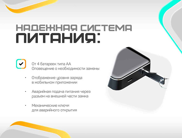 Замок работает от 4 пальчиковых батареек типа AA. Срок службы, которых более 12 месяцев.