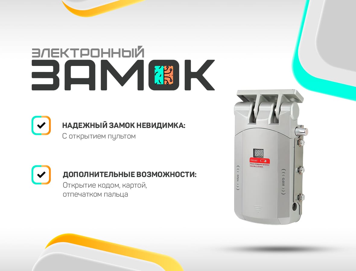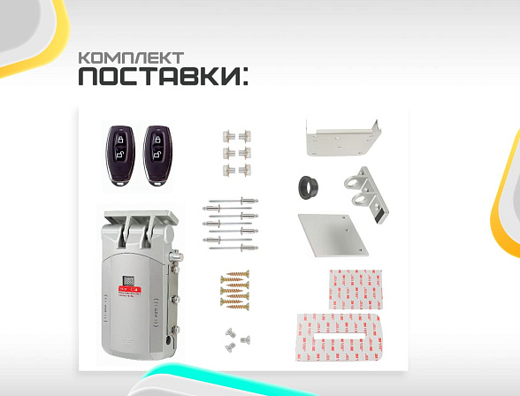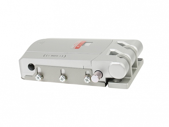 Электронный дверной замок с механизмом запирания в виде крюка и с возможностью дистанционного открытия с помощью пульта.