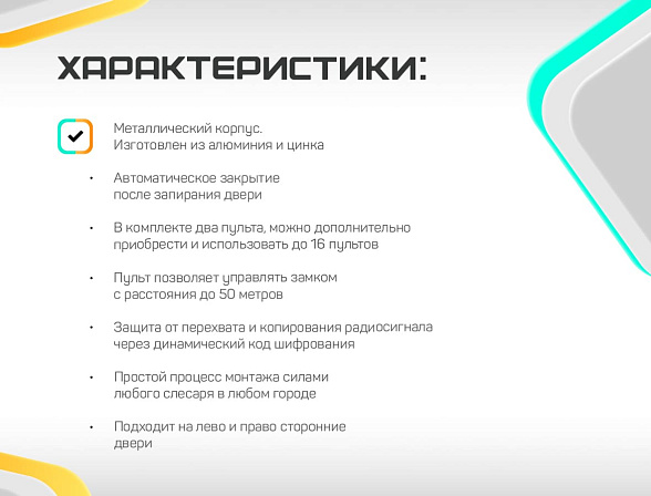 Радиообмен с использованием динамического кода обеспечивает защищенный канал для передачи команд между пультом и замком. И в отличие от аналогов не может быть перехвачен и скопирован с помощью специального оборудования.