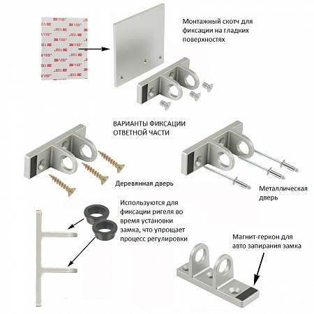 В комплекте с замком есть специальные крепления с монтажным двусторонним 3М скотчем, который позволяет установить замок на любую одностворчатую и двустворчатую стеклянную дверь.