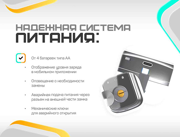 Подать питание можно через разъем Micro USB, который расположен на наружной части замка. Это можно сделать либо через обычный блок питания мобильного телефона либо от внешнего аккумулятора (типа Power Bank).