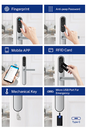 Открыть замок можно не только при помощи ввода пароля, но и при помощи пластиковой карты и отпечатка пальца.