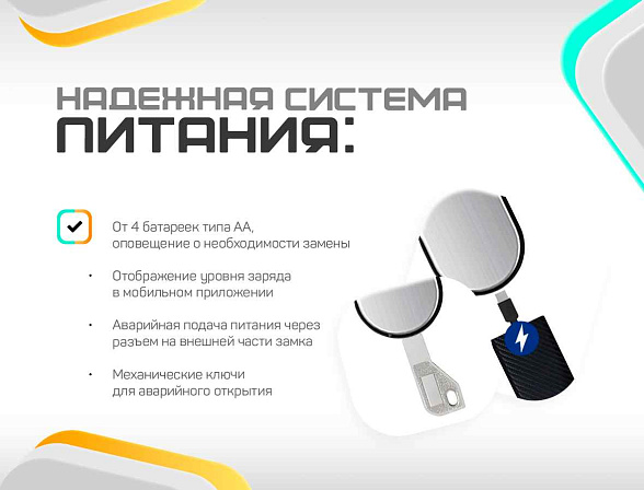 Замок работает от 4 пальчиковых батареек типа AA. Срок службы, которых более 12 месяцев.