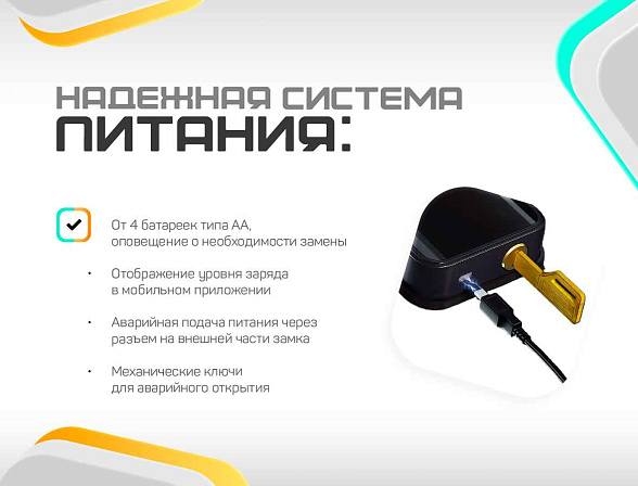 Подать питание можно через разъем Micro USB, который расположен на наружной части замка. Это можно сделать либо через обычный блок питания мобильного телефона либо от внешнего аккумулятора (типа Power Bank).