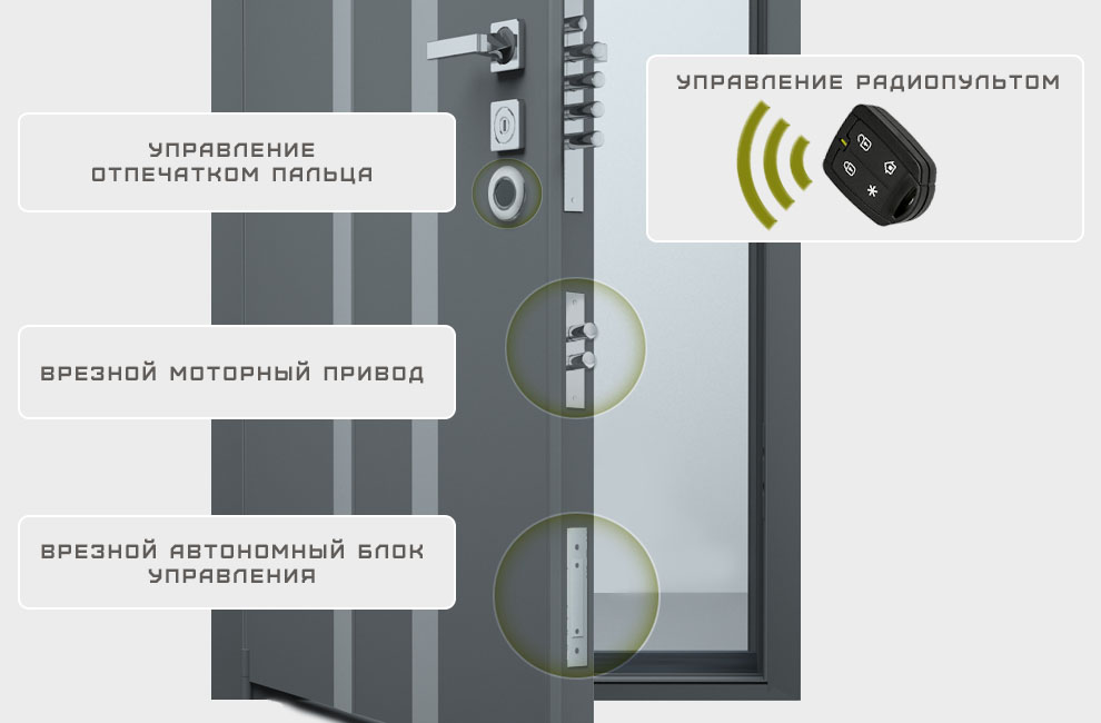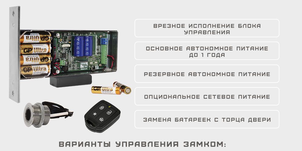 Управление электронным замком с помощью отпечатком пальца и пультами. Все части замка находятся внутри двери - ничего не видно ни снаружи, ни изнутри. Работает до 1 года от батареек + резервная батарейка на случай отказа основных. Второй запорный привод по желанию. Опциональное подключение датчика двери, кнопки выхода.