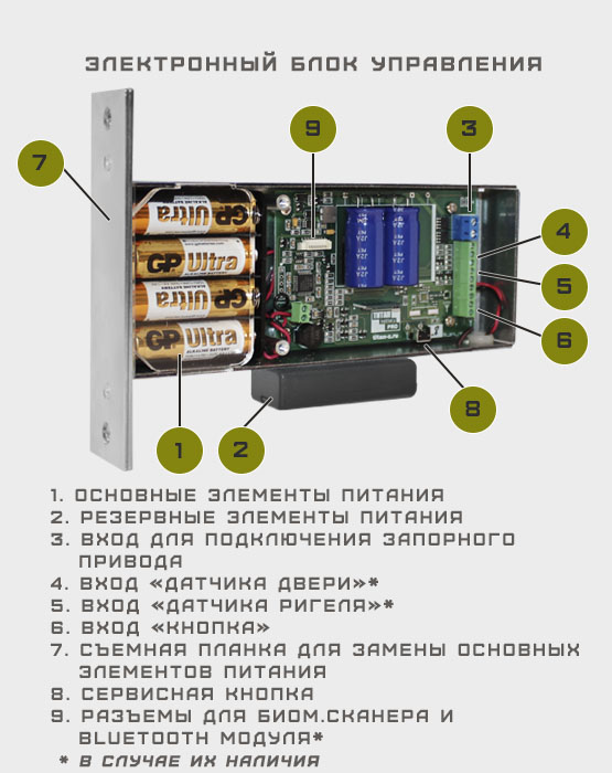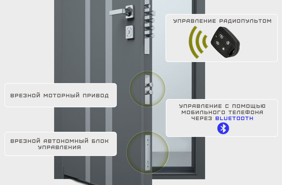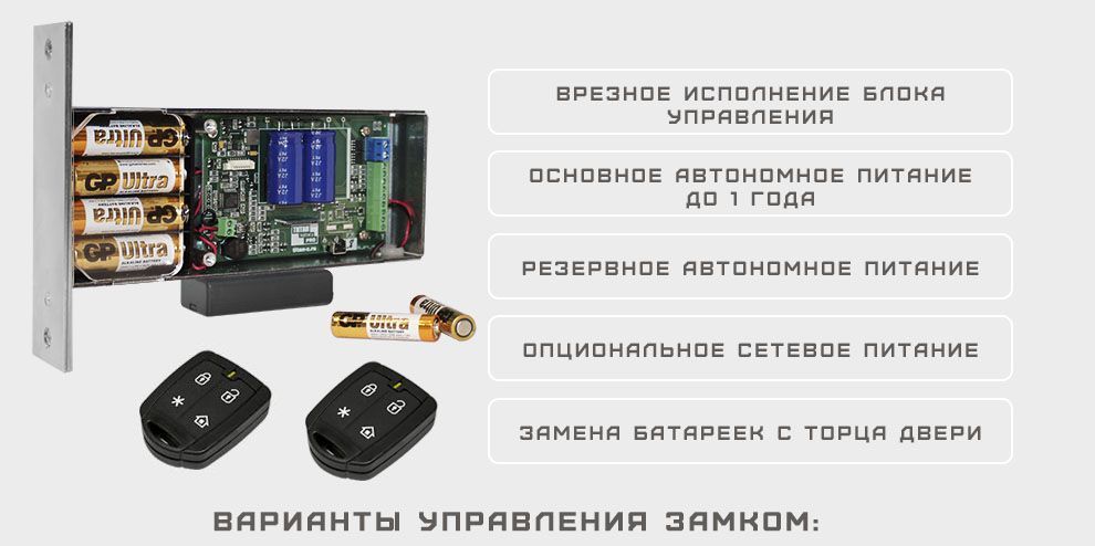 УПРАВЛЕНИЕ ЗАМКОМ: радиоуправление (все модификации), через смартфон (мод.BLUETOOTH), биометрический считыватель (мод.BIOMETRIC), вход КНОПКА