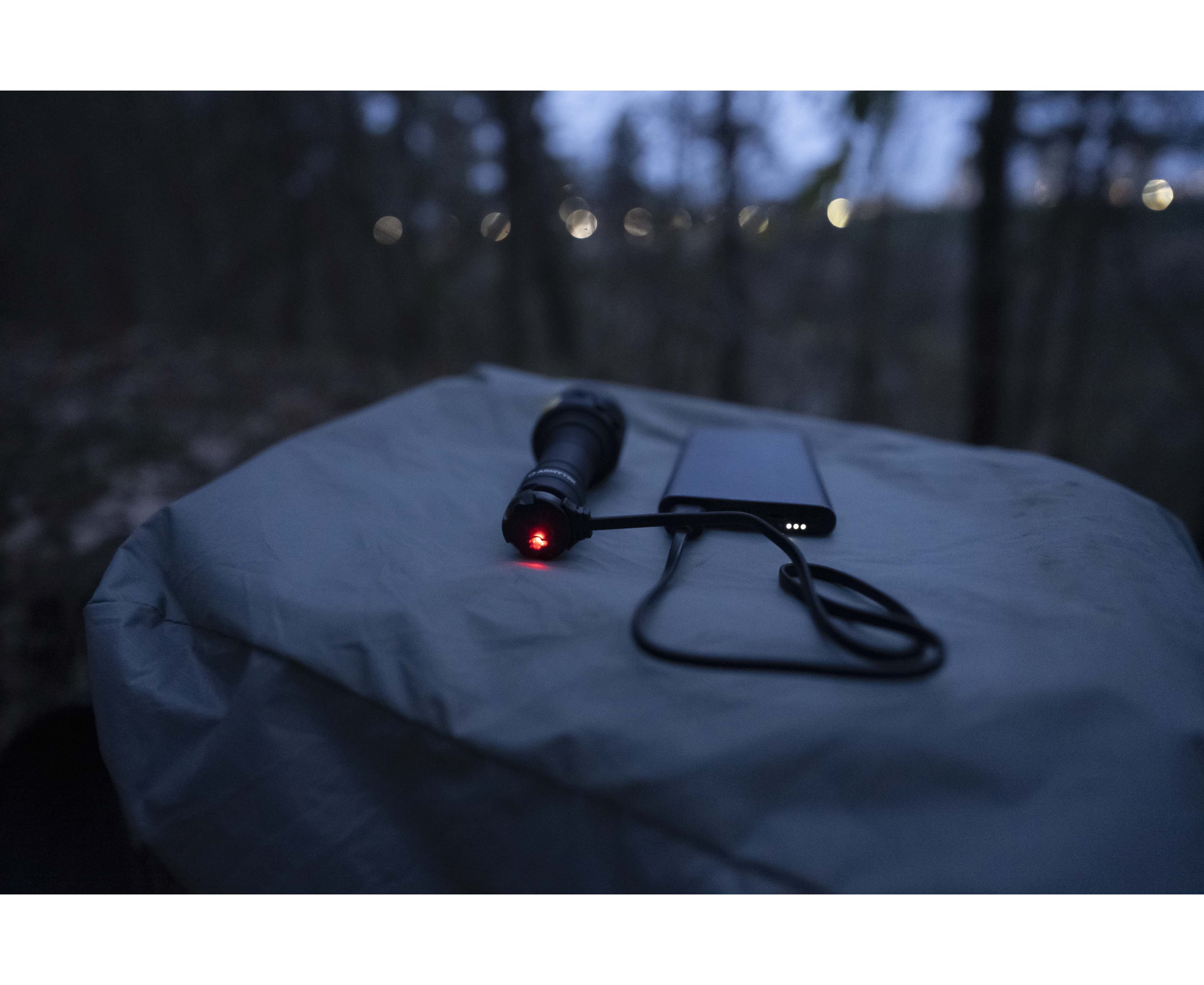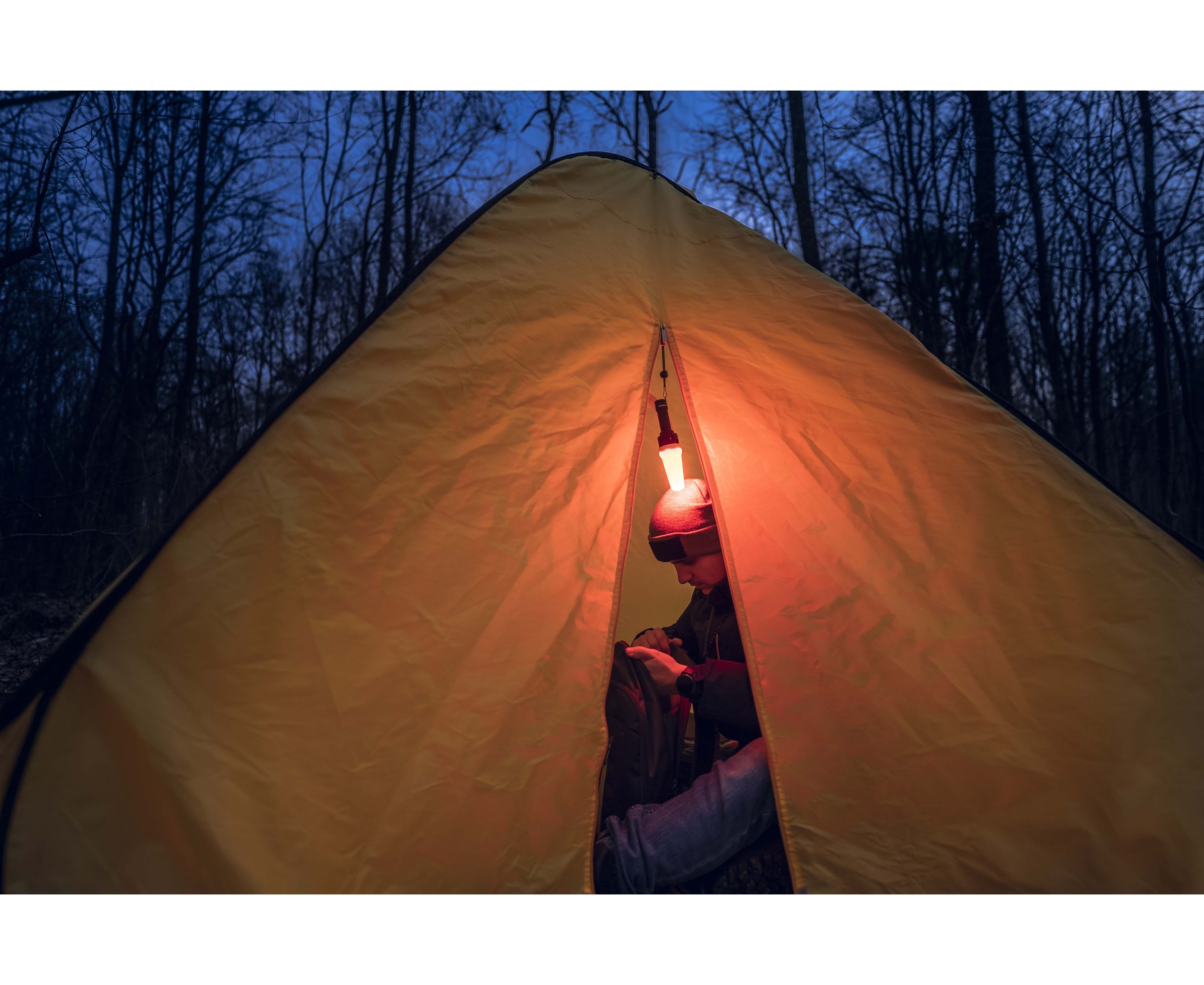 В комплект входит специально разработанный белый силиконовый конус, который обеспечивает всенаправленный свет, видимый со всех сторон. Такой рассеянный свет можно использовать для освещения палаточного лагеря во время выезда на природу: Bear WRG крепится к ветке дерева или к крюку под потолком палатки с помощью прочного ремешка. В фонаре также присутствует режим Маячок каждого цвета света для подачи сигналов с силиконовым конусом или без него при регулировании дорожного движения или в аварийной ситуации. Фонарь работает на комплектном аккумуляторе 21700 Li-Ion или на стандартном элементе питания 18650 Li-Ion с использованием адаптера.