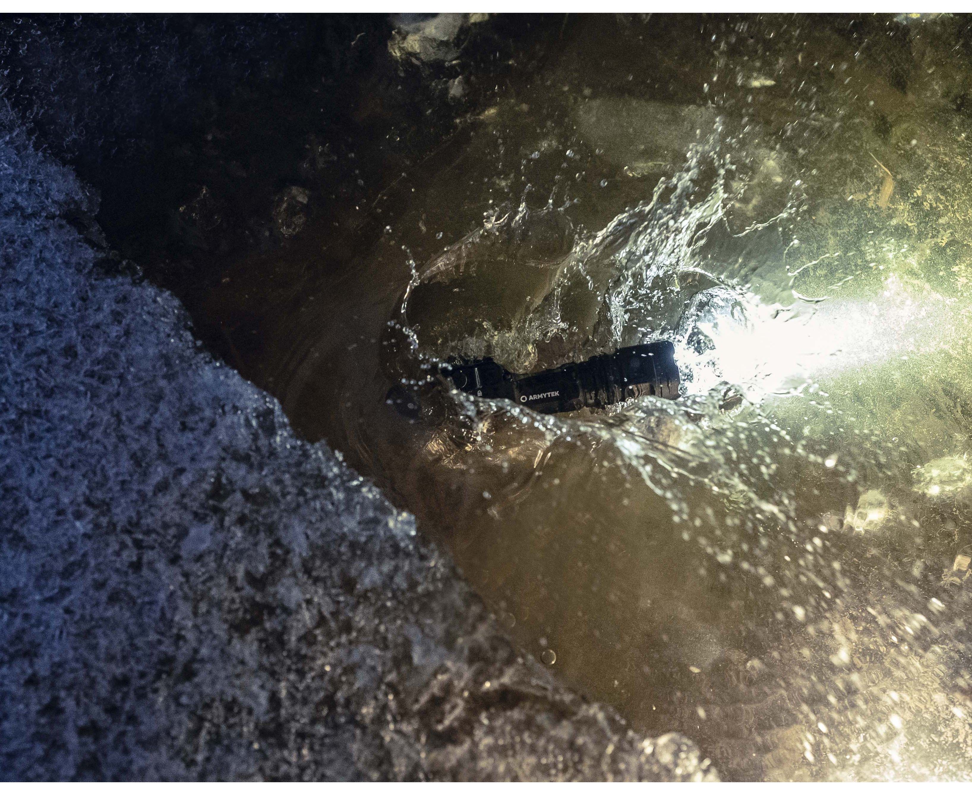 Полная защита фонаря от воды, грязи и пыли по стандарту IP68. При установленной выносной тактической кнопке класс защиты соответствует IP67. Выдерживает падение с 10 метров.