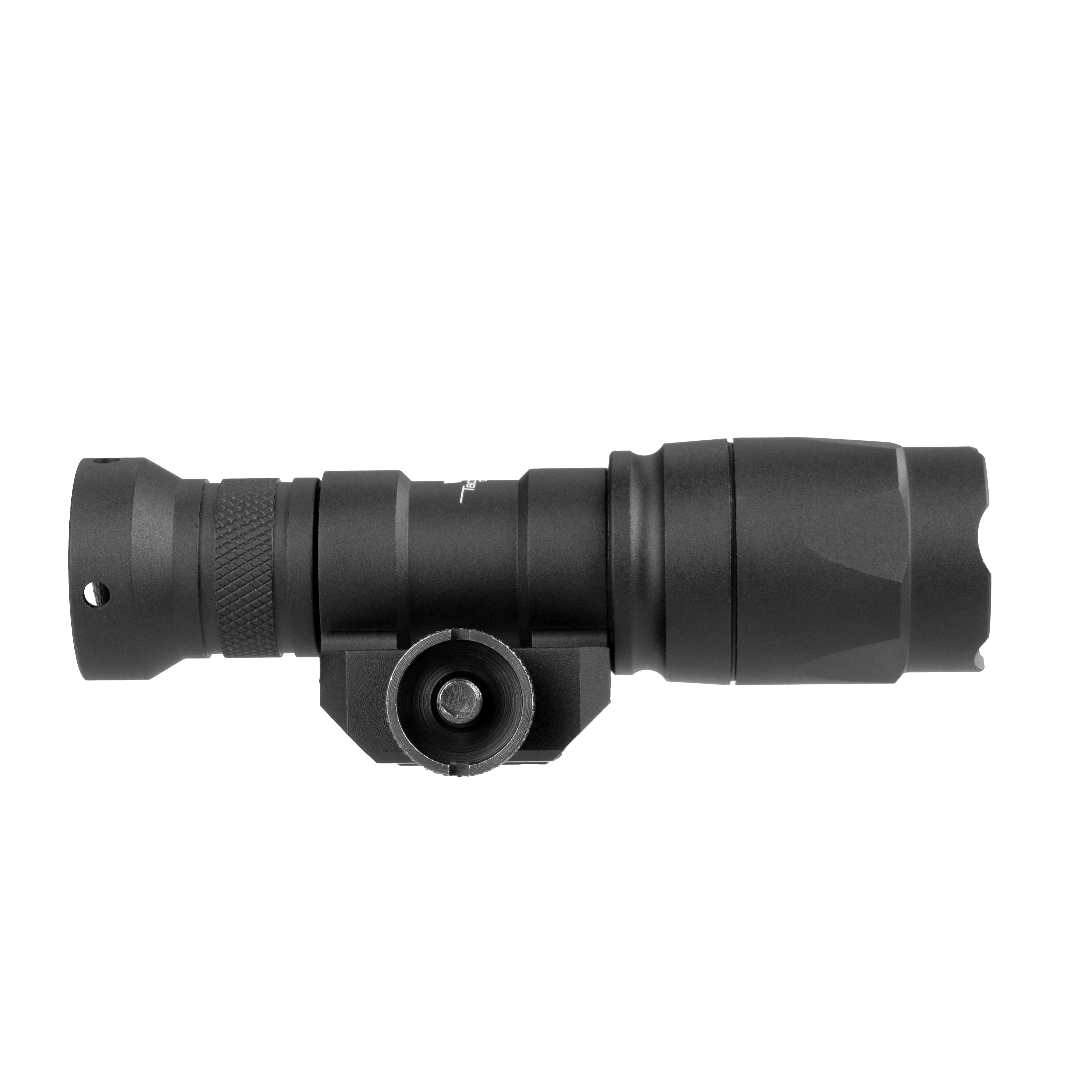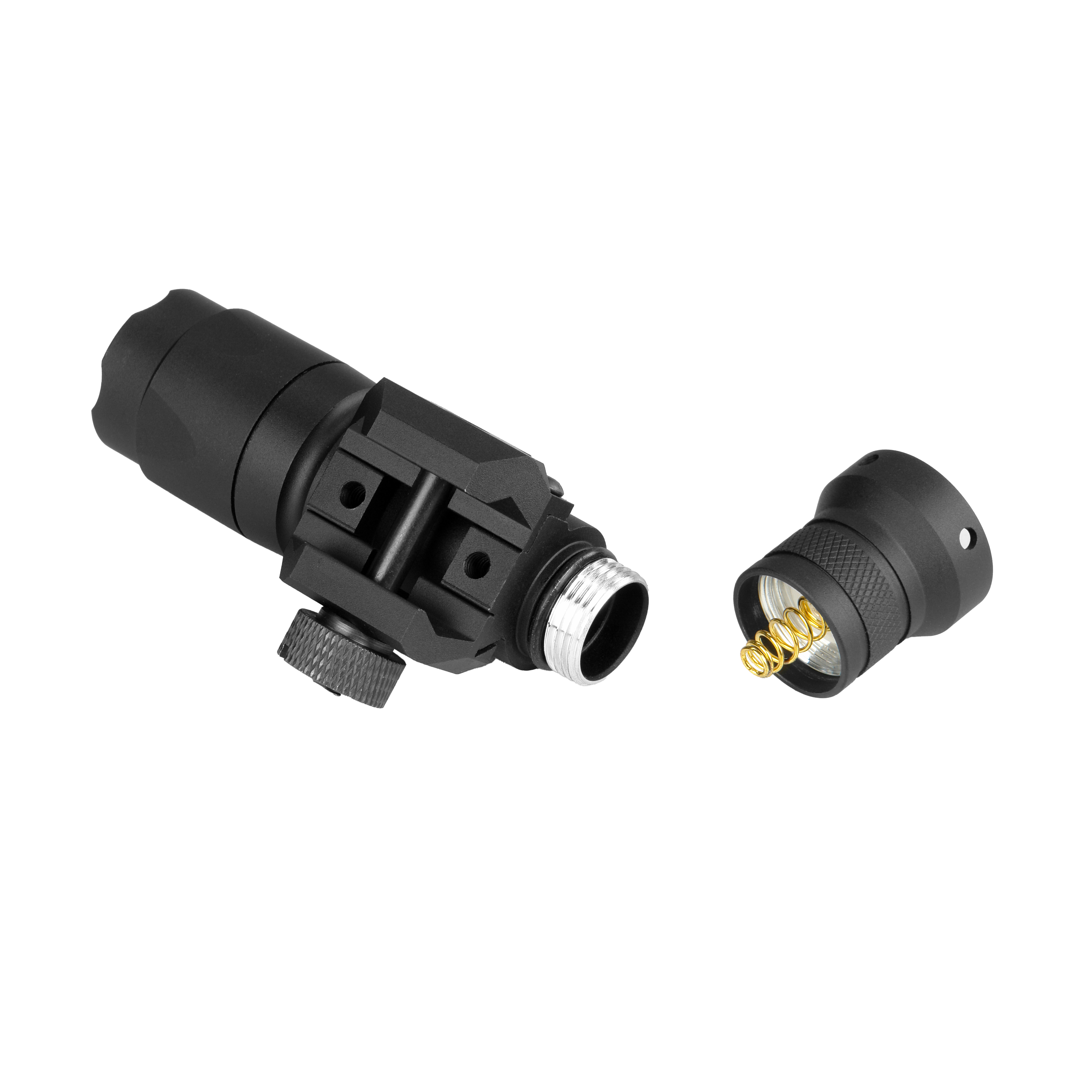 Для мгновенной активации света служит выносная тактическая кнопка с прямым приводом, которая подключается к дополнительной крышке с контактным гнездом. Фонарь будет светить только при удержании кнопки и мгновенно отключится, если ее отпустить. С такой кнопкой не придется менять положение рук во время прицеливания для включения фонаря.
