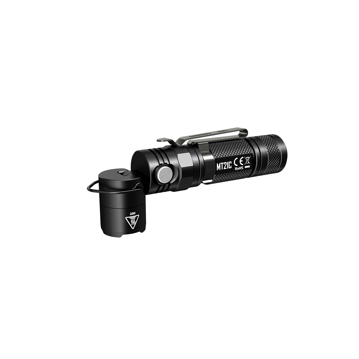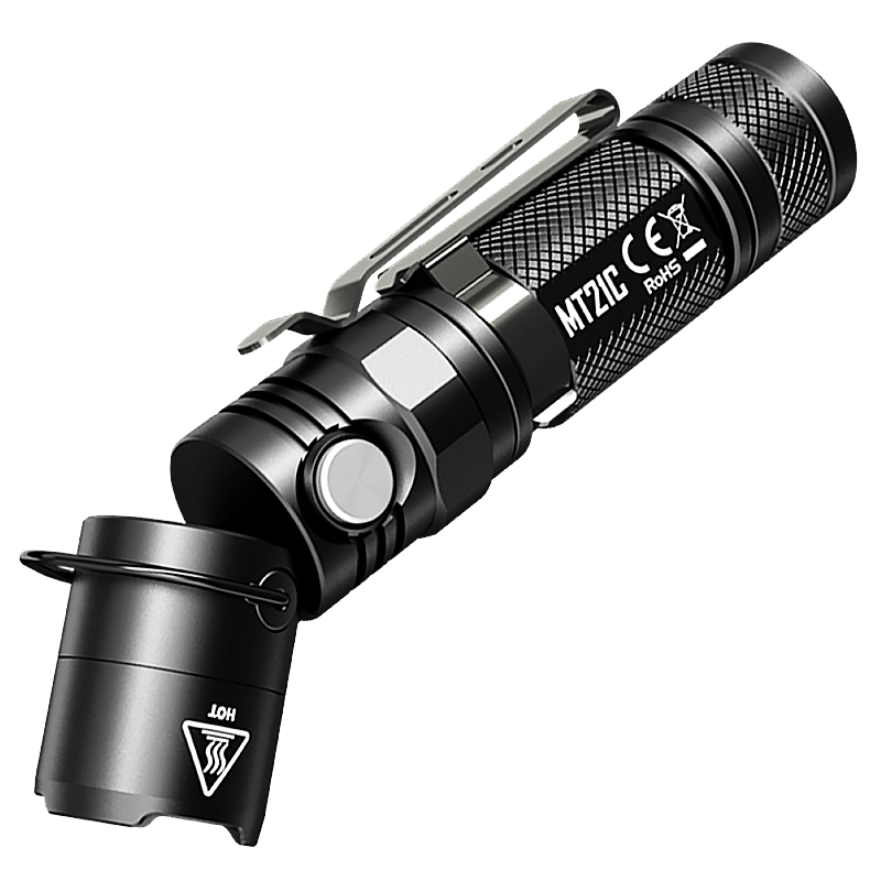 "Голова" фонаря легко поворачивается одной рукой на 90°, что превращает MT21C из ручного фонаря в карманный Г-образный. Это дополнительно расширяется область его применения и делает гораздо более универсальным. Рядом с сочленением есть небольшое металлическое кольцо, которое позволяет повесить фонарь на крючок или ветку. В плоский торец корпуса встроен магнит, благодаря которому Вы сможете закрепить фонарь на любой металлической поверхности под любым углом.