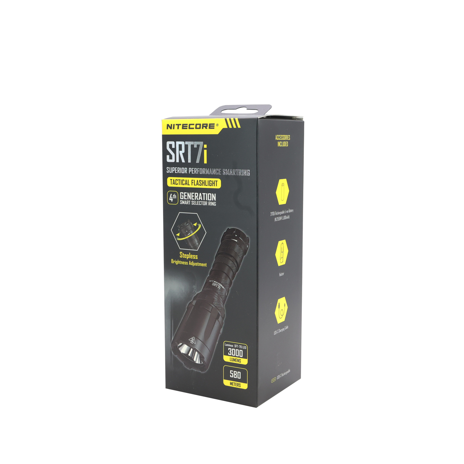 SRT7i совместим исключительно с аккумуляторами NITECORE 21700 i Series с выходом в 15 А и аккумуляторами CR123/RCR123.