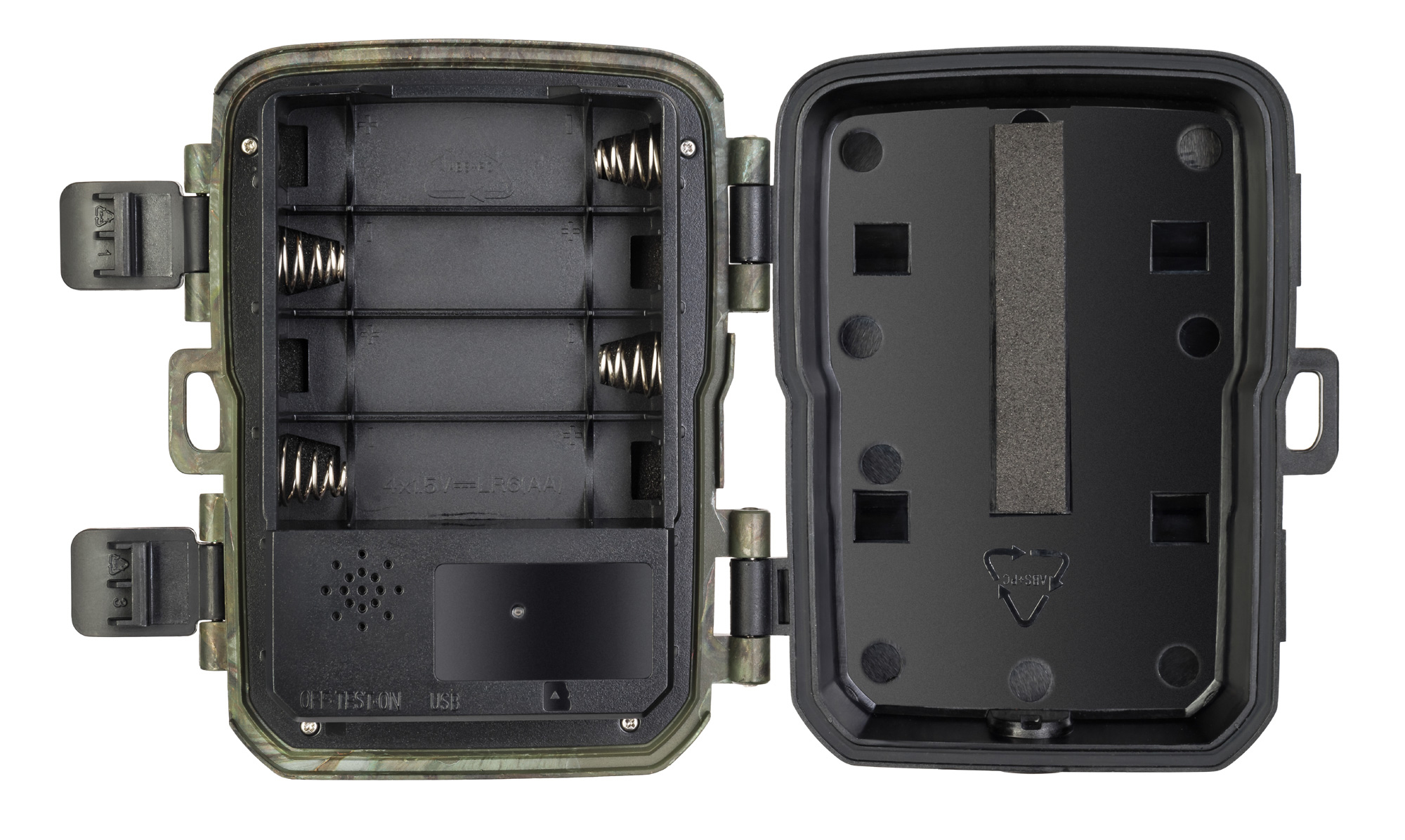 Фотоловушку можно спокойно размещать на улице в любое время года: она защищена от пыли и мощных струй воды и стабильно работает на жаре и морозе. В комплекте есть штатив и набор креплений для фиксирования фотоловушки на дереве или стене. Питание камеры – 4 батарейки типа АА (нет в комплекте) или внешний источник.
