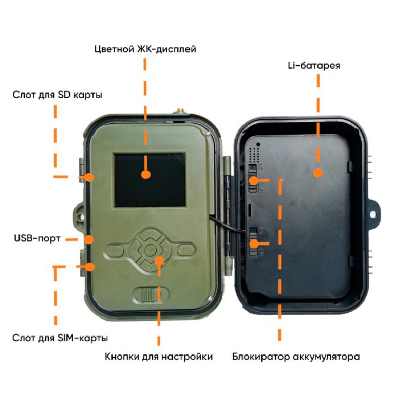 Принцип работы фотоловушки заключается в сохранении фото или видеозаписи по срабатыванию датчика движения, а также в автоматической отправке полученных фото пользователю через мобильное приложение. Благодаря простому меню на русском и широким возможностям по настройке, устройство можно подогнать под практически любые нужды! Максимальное разрешение для видео – 4K 2160р с частотой 30 fps, а для фото – 36 мегапикселей (что гораздо больше, чем у предыдущей модели HC900Pro). Все фото и видеофайлы можно легко посмотреть на встроенном 2" дюймовом ЖК экране. Для хранения файлов используются карты памяти формата microSD объёмом до 265 гигабайт (в комплект не входит). Устройство обладает умеренным потреблением энергии, а благодаря встроенному литиевому аккумулятору на 8 000 mAh время стабильной работы было значительно увеличено! Диапазон рабочих температур составляет от -40 до +70 градусов, однако для работы на морозе стоит позаботиться о приобретении специальных элементов питания - поэтому советуем заранее купить солнечную батарею SP - 06. В штатном рабочем положении экран и внешние органы управления прячутся под защитной крышкой, потому что фотоловушка HC940PRO, специально разработанная для применения в условиях дикой природы, имеет надёжную защиту от погодных факторов, в том числе и от воздействия отрицательной температуры - корпус изготовлен в соответствии с защитным классом IP65, так что устройство не боится пыли, брызг воды и грязи.