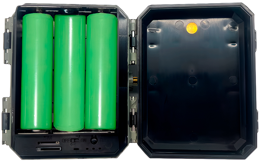 Фотоловушка оснащена 3 аккумуляторами Li-ion 18650 и солнечной панелью. Благодаря ей в ясную погоду производится подзарядка аккумуляторов, что продлевает их время работы. Прибор способен автономно функционировать до 3 месяцев.