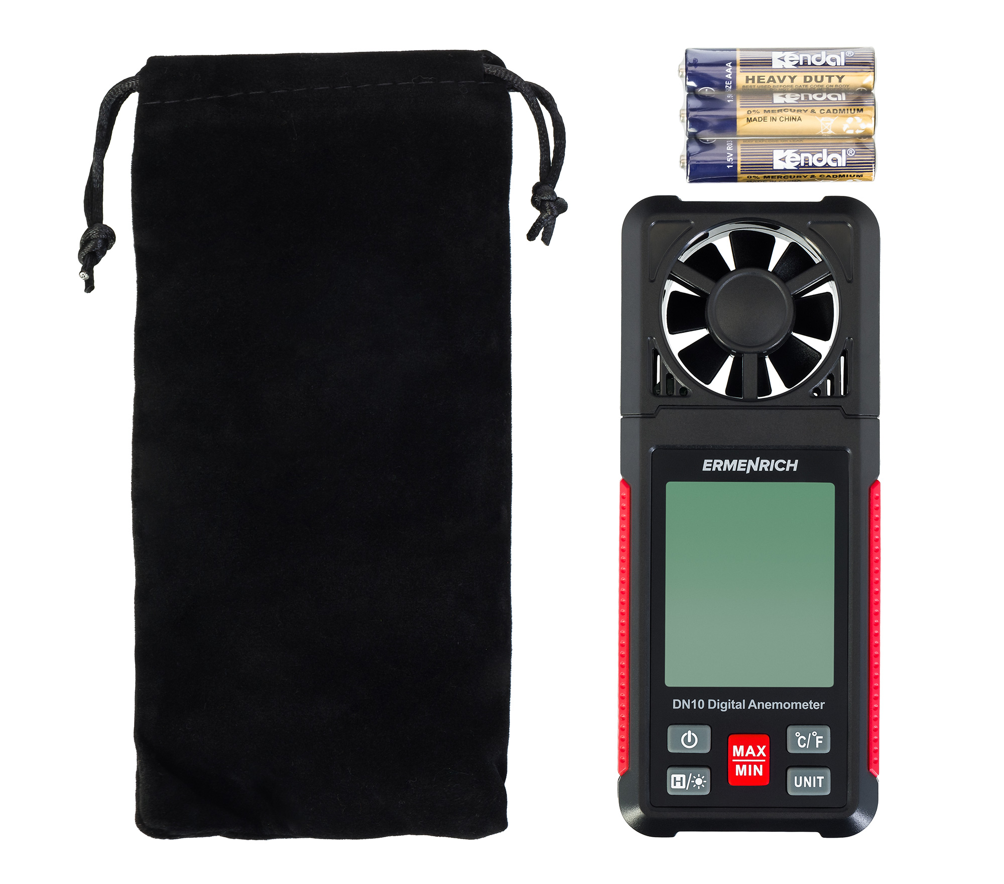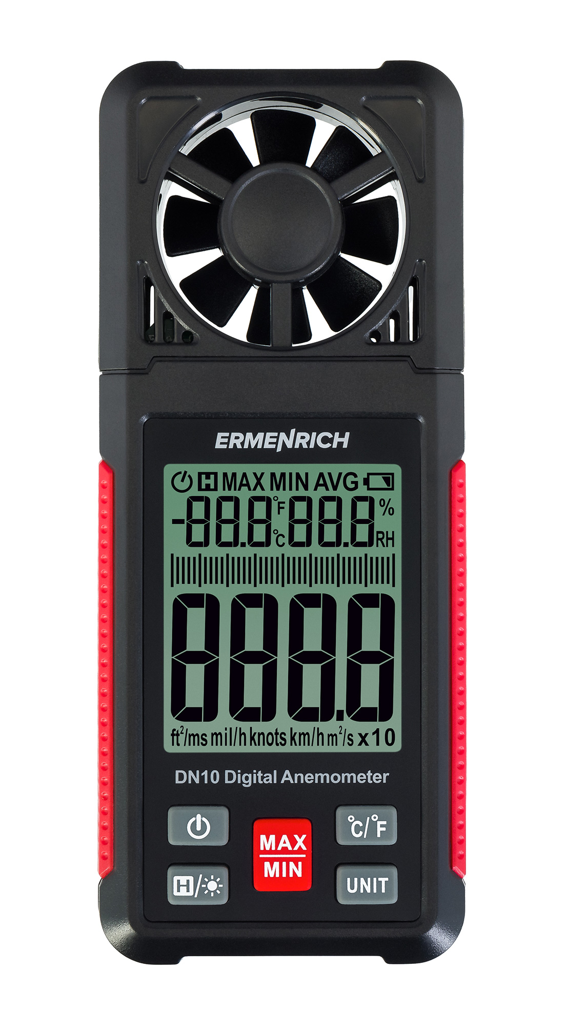 Цифровой анемометр Ermenrich Seek DN10 – профессиональный измерительный инструмент, который позволяет отслеживать скорость воздушного потока, температуру и влажность воздуха на улице или в помещении. При этом прибор имеет небольшой размер, эргономичный корпус и работает полностью автономно.