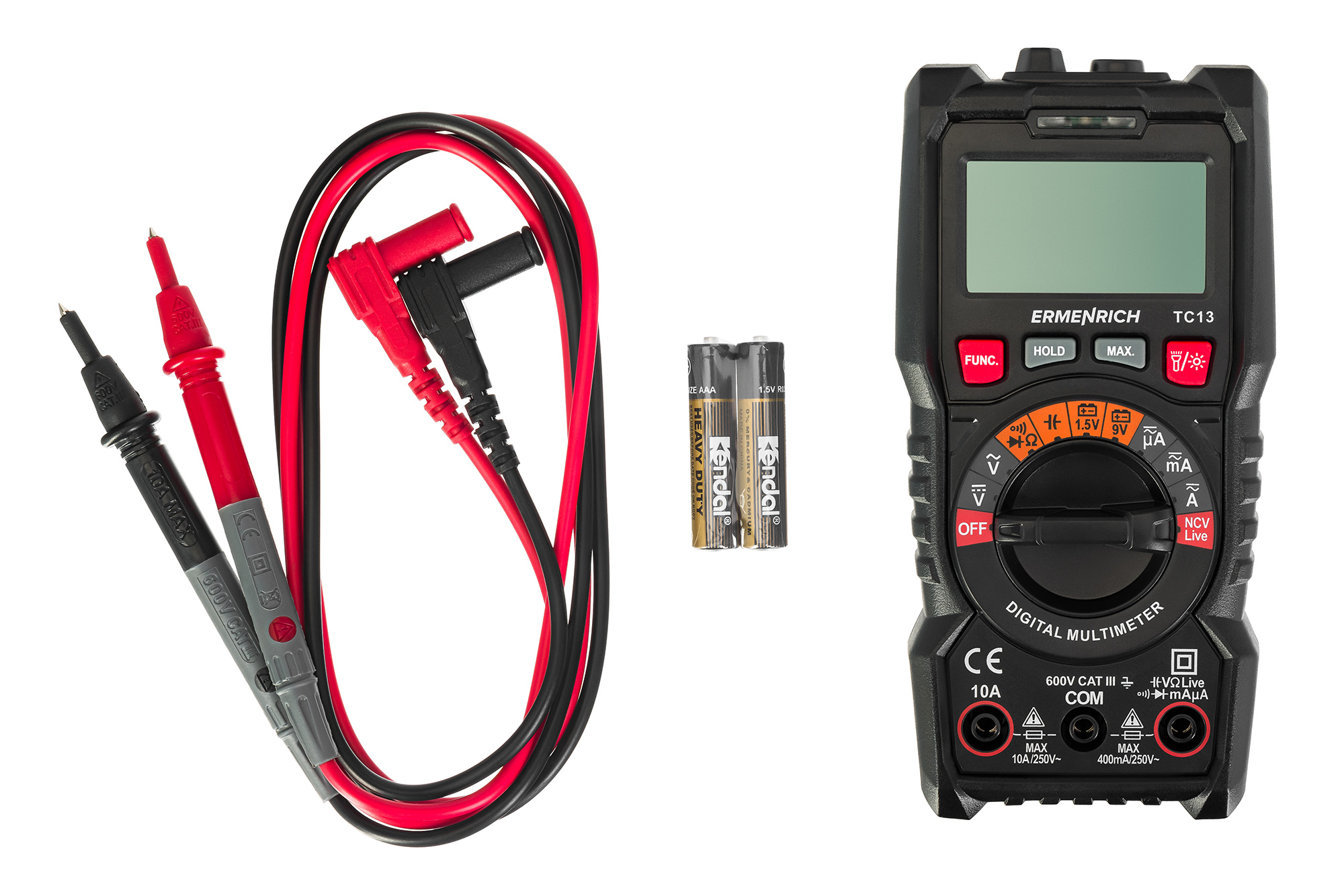 Цифровой мультиметр Ermenrich Zing TC13 – многофункциональное портативное устройство для диагностики электрических сетей и измерения характеристик электрического сигнала. Прибор ориентирован на профессиональное использование техническими экспертами, но может применяться и неспециалистами для решения бытовых задач. Помимо напряжения, силы тока и сопротивления с его помощью можно измерять емкость, частоту и рабочий цикл.