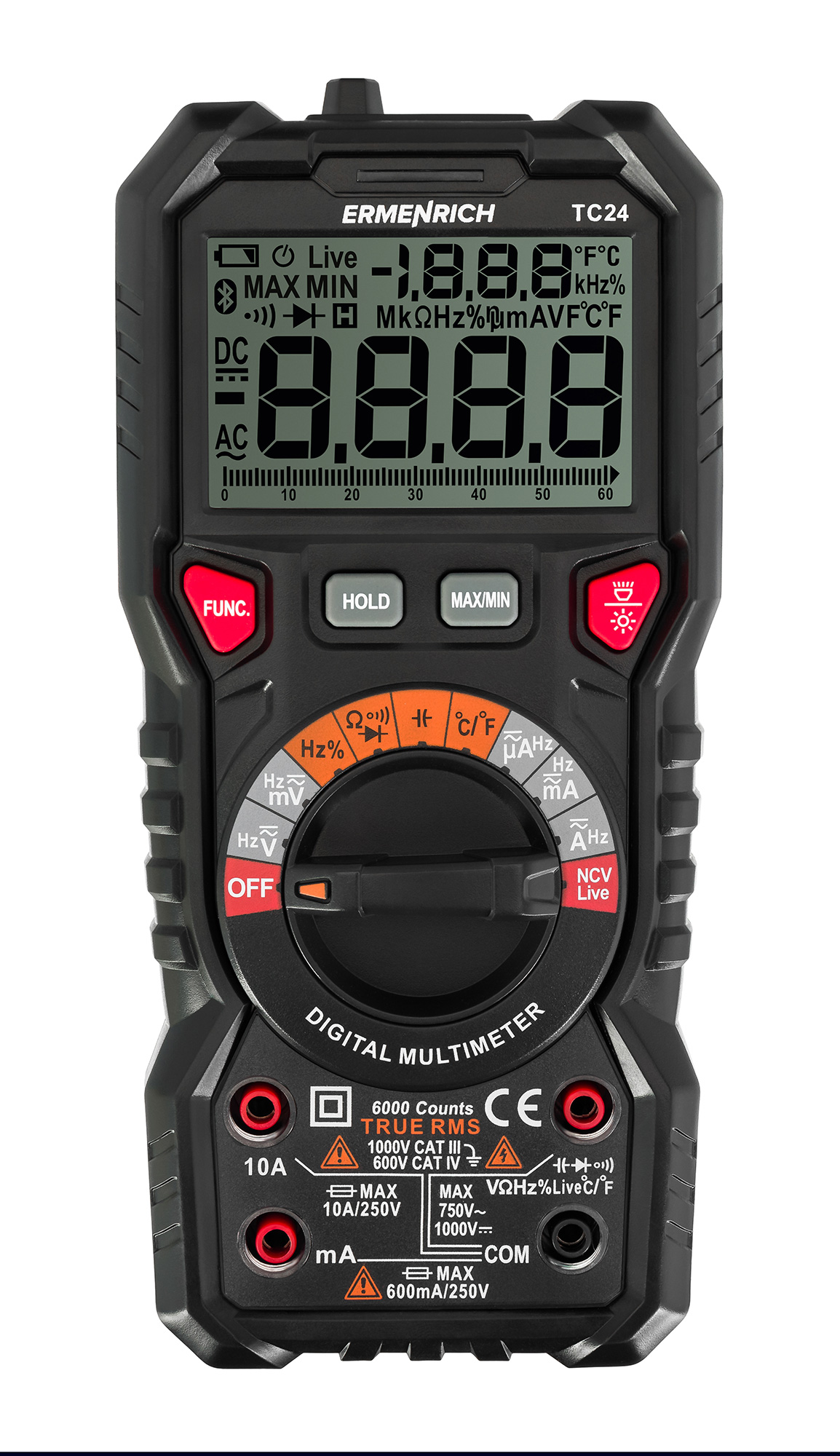 Цифровой мультиметр Ermenrich Zing TC24 – профессиональный прибор для диагностики электрических сетей и оборудования, а также измерения их характеристик: сопротивления, напряжения, силы тока, рабочего цикла, частоты, емкости, температуры. Высокая достоверность измерений достигается за счет использования истинного среднеквадратичного значения (True RMS), а автоматический выбор предела измерения упрощает работу с прибором. Мультиметр выполнен компактно и надежно, питание осуществляется от стандартных батареек.