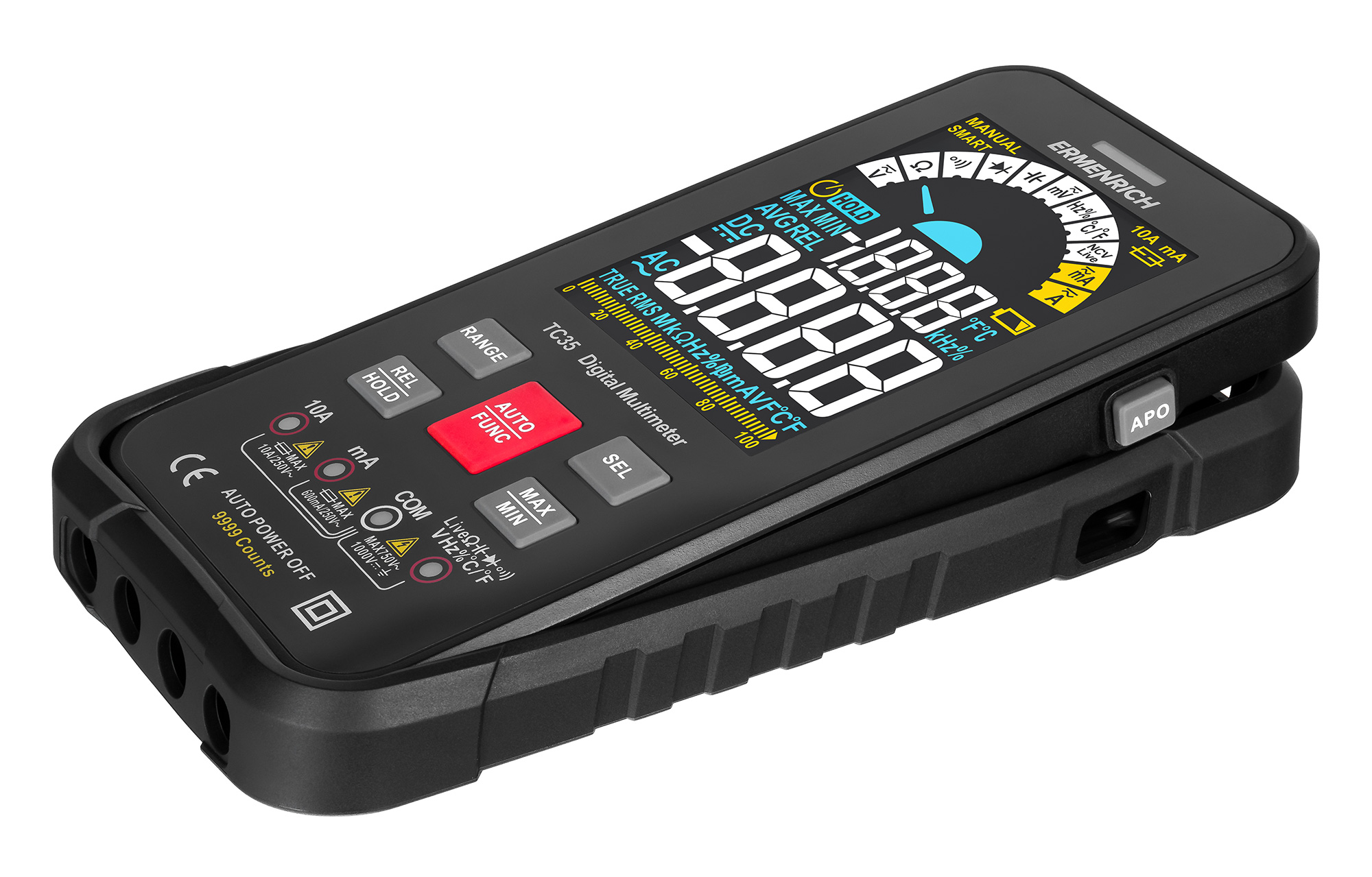 Цифровой мультиметр Ermenrich Zing TC35 объединяет в себе функции нескольких электроизмерительных приборов: вольтметра, амперметра, омметра, фарадометра и частотомера. Также с его помощью измеряется рабочий цикл и определяется температура. Выбор предела измерений может быть осуществлен вручную или в автоматическом режиме. Мультиметр имеет компактные размеры, мало весит, оборудован цветным экраном с цифровой индикацией и графической шкалой. Работу в слабо освещенных помещениях упрощает наличие подсветки экрана и встроенный фонарик.