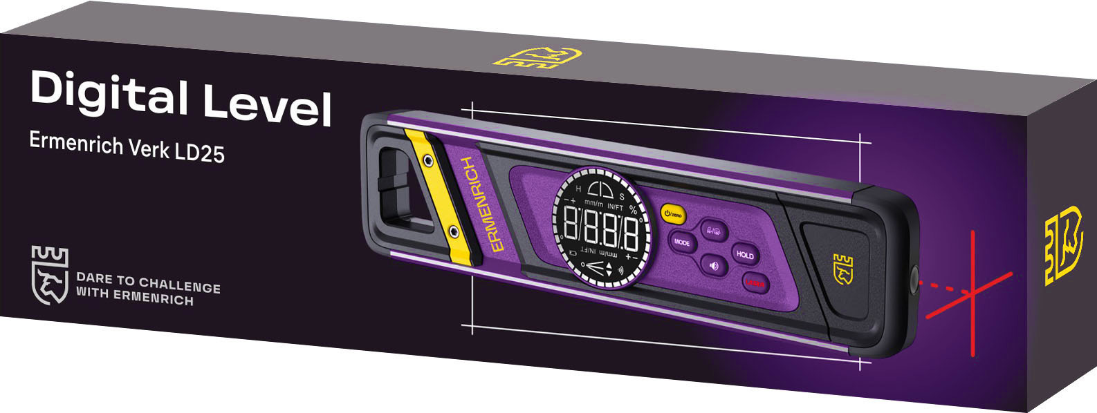 Ermenrich Verk LD25 объединяет высокую точность измерений и компактный ударопрочный корпус, который легко помещается в карман куртки или ящик с инструментами. Встроенный лазер формирует идеально ровные горизонтальную и вертикальную линии, поэтому прибор становится незаменимым при монтаже и отделке, где требуется строгая геометрия.