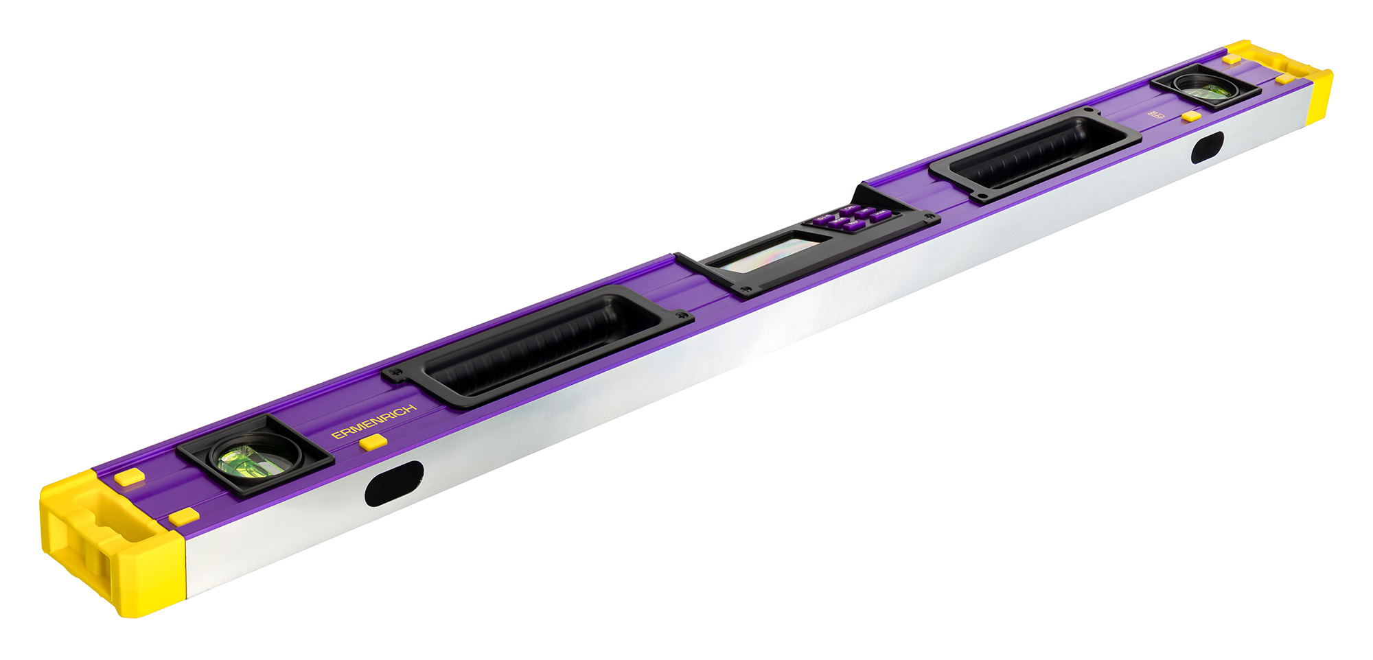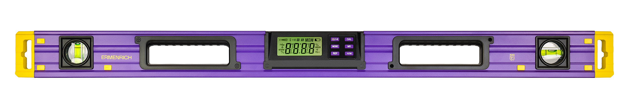 Все измерения выводятся на ЖК-экран, единицы измерения выбираются пользователем из нескольких вариантов. Пыле- и влагозащищенный корпус цифрового уровня Ermenrich Verk LY80 дополнен магнитным креплением и окрашен в яркий цвет, что снижает риск потери прибора в условиях стройплощадки. Для экономии энергии батареек (тип ААА, 2 шт.) предусмотрена функция автоматического отключения через 3 минуты бездействия. Имеется индикация низкого заряда. Аналоговая часть – 2 пузырьковых ампулы – облегчает предварительные работы и дает возможность использовать устройство при разряженных батарейках.