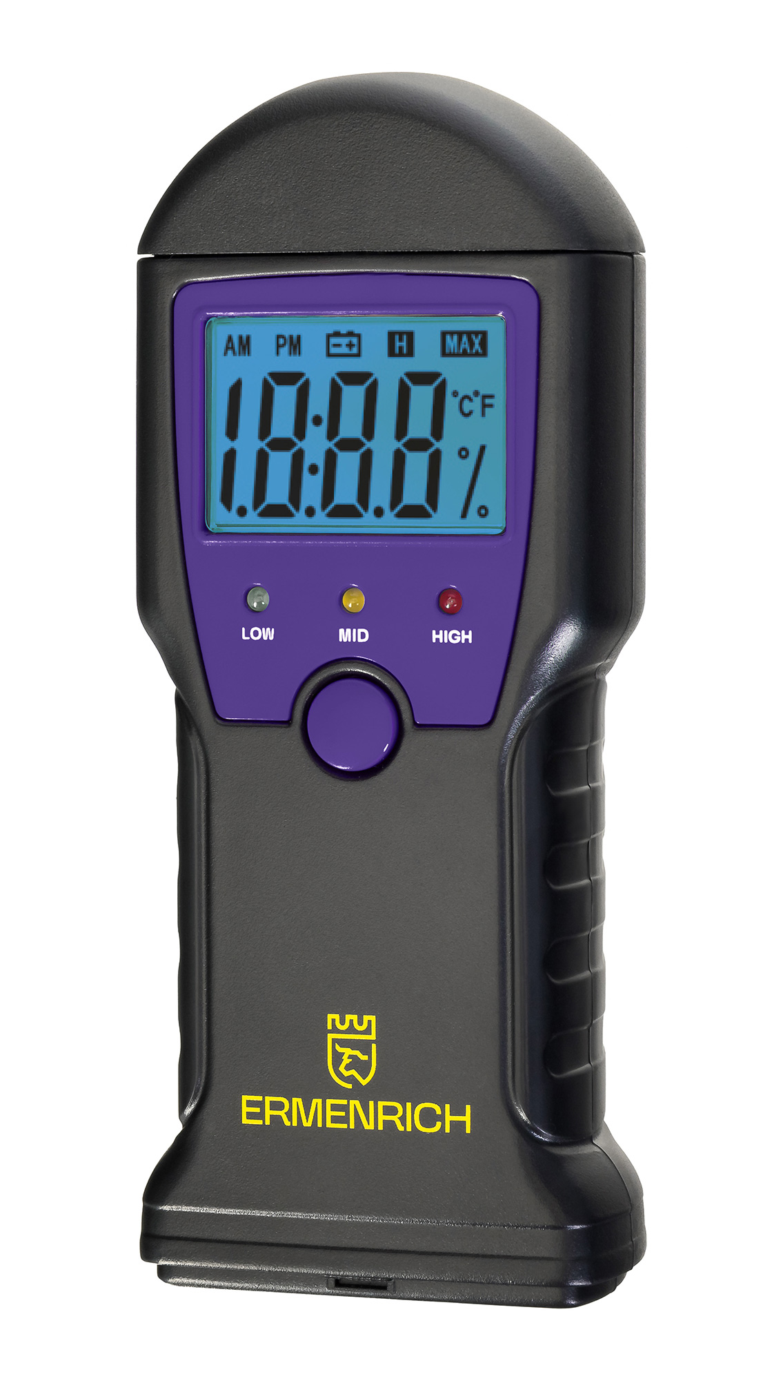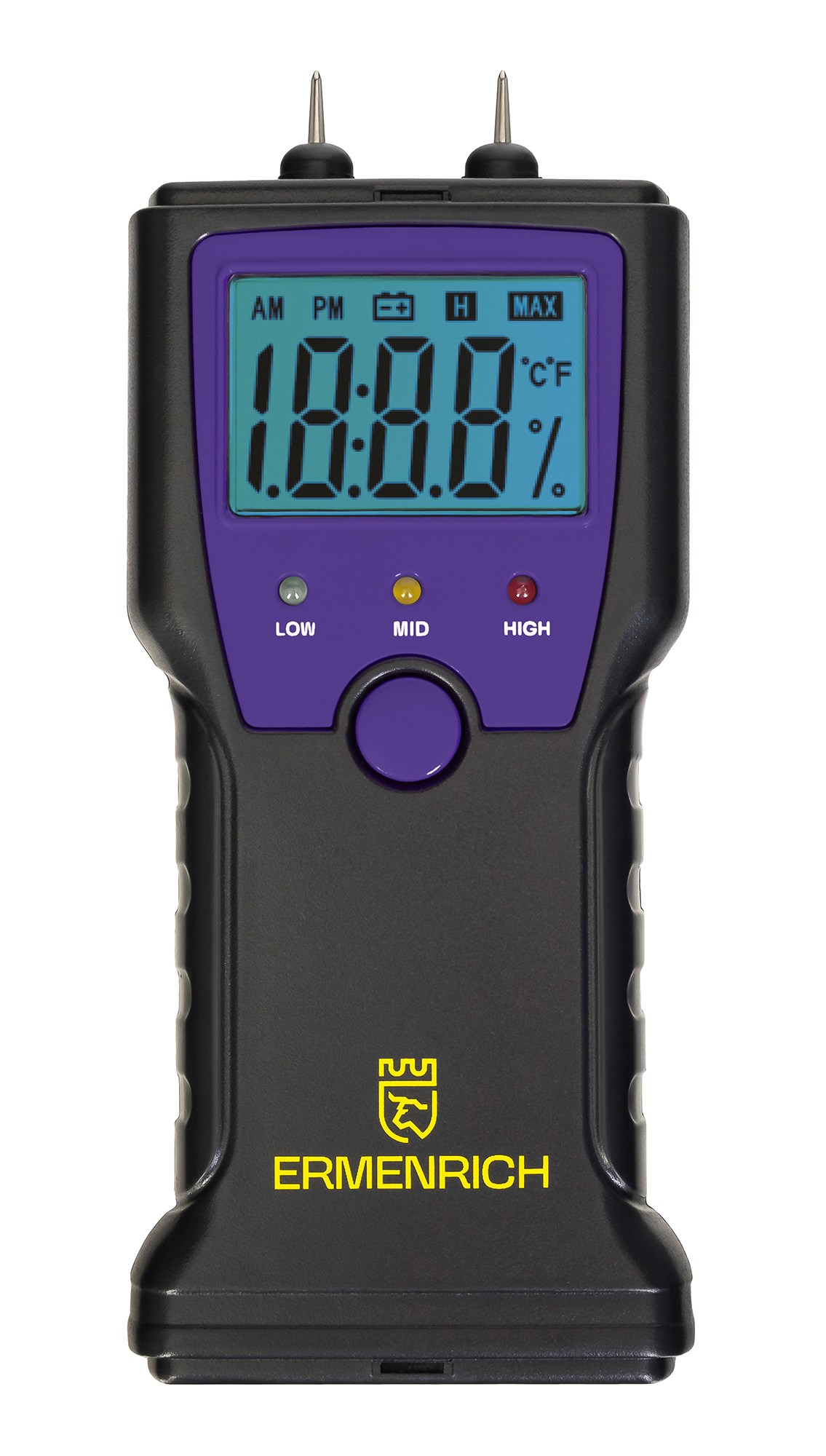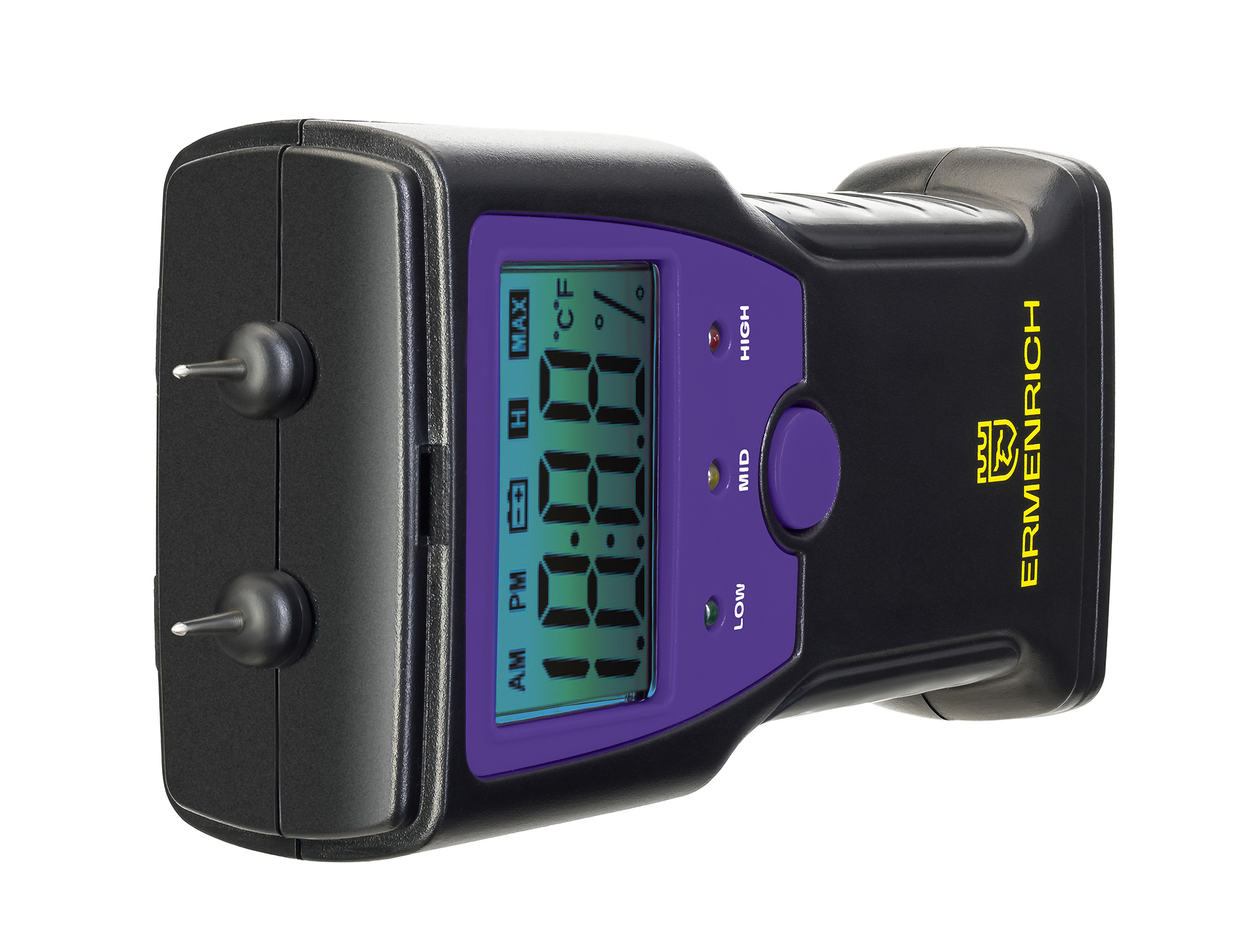 Ermenrich Wett MW10 – это игольчатый влагомер для определения влажности древесины, строительных смесей и растворов. Прибор также умеет фиксировать температуру в градусах Цельсия или Фаренгейта. Управление простое – при помощи одной кнопки. Результаты измерений отображаются на встроенном экране с крупной индикацией и яркой голубой подсветкой. Под экраном расположены три светодиода, которые дают общую оценку измеренному: зеленый указывает на низкую влажность, желтый – на повышенную, красный – на высокую.