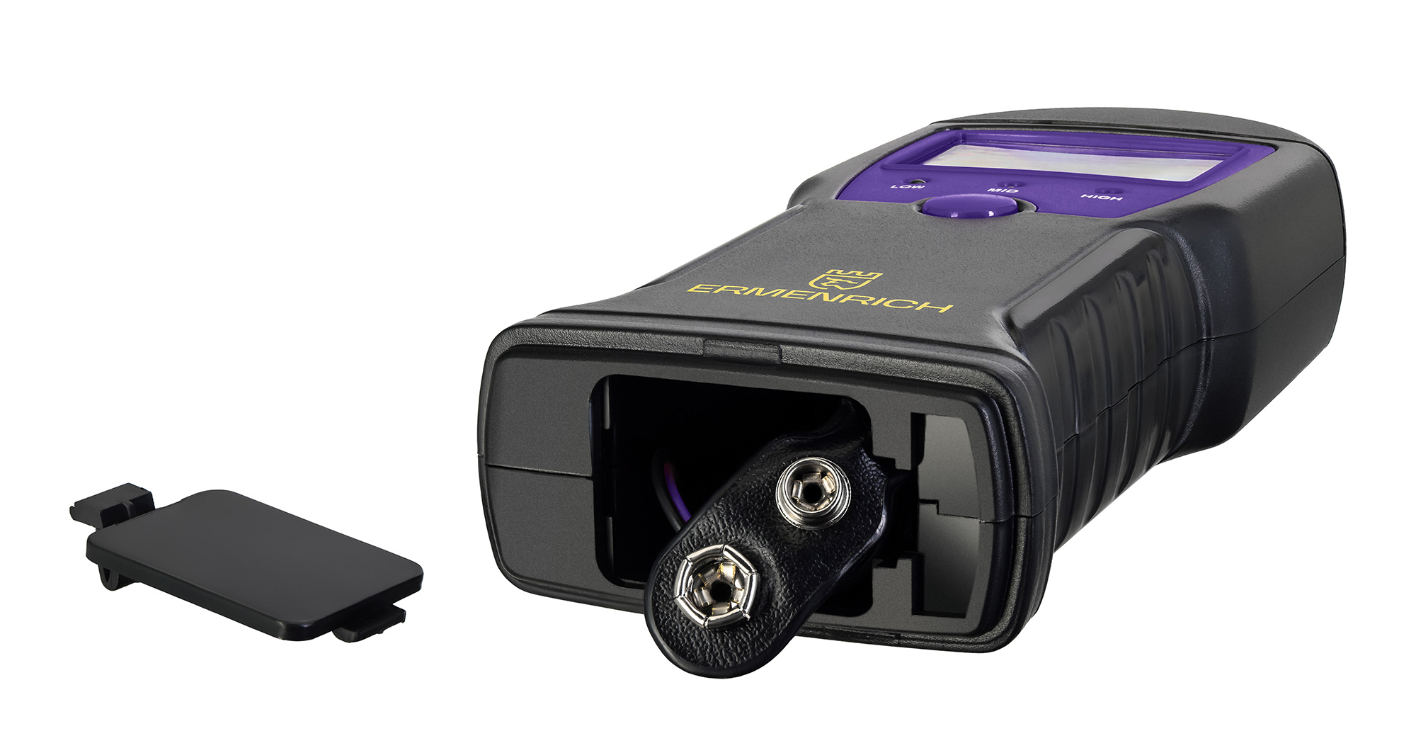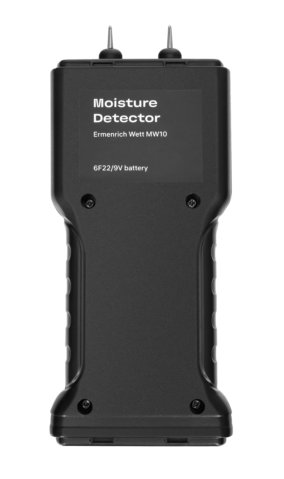 Прибор выполнен довольно компактно и имеет небольшой вес – его нетрудно удерживать в руке. Игольчатые сенсоры спрятаны под съемную крышку. В нижней части находится отсек для 9-вольтовой батарейки. Для контроля расхода питания прибор оборудован функцией автоотключения и индикатором низкого заряда батарейки в виде иконки на экране.