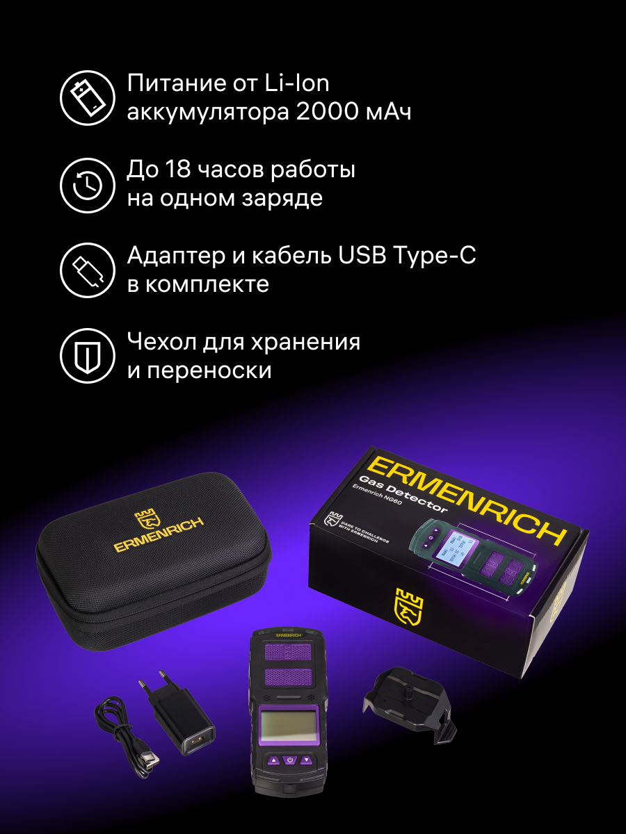 Газоанализатор Ermenrich NG60 необходим для определения концентрации горючих газов, сероводорода и кислорода в воздухе и обеспечения безопасности на производстве или в быту. В зависимости от типа газа, прибор измеряет его концентрацию в % LEL (нижний концентрационный предел распространения пламени), ppm или VOL. Порог срабатывания можно настроить вручную.