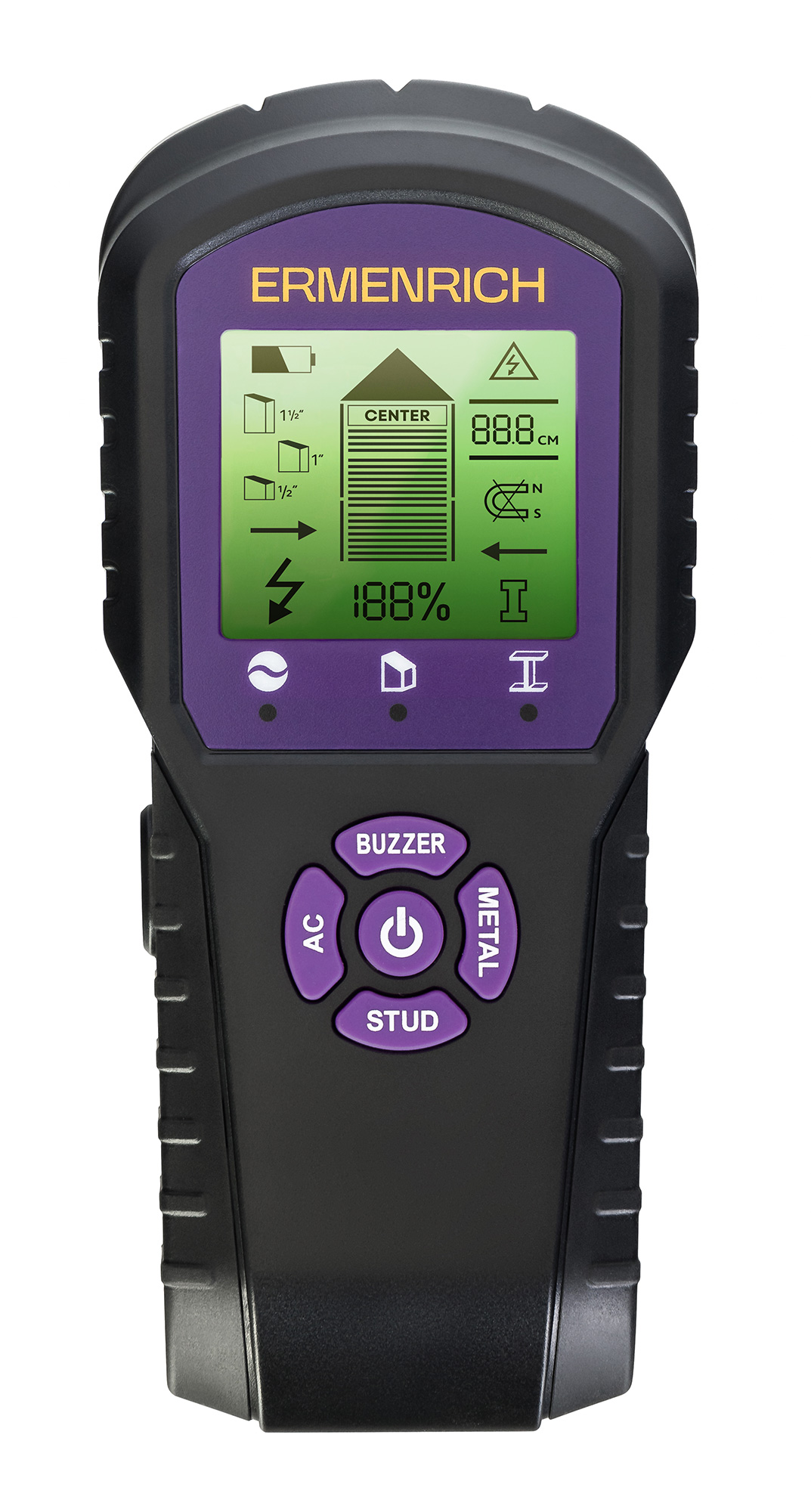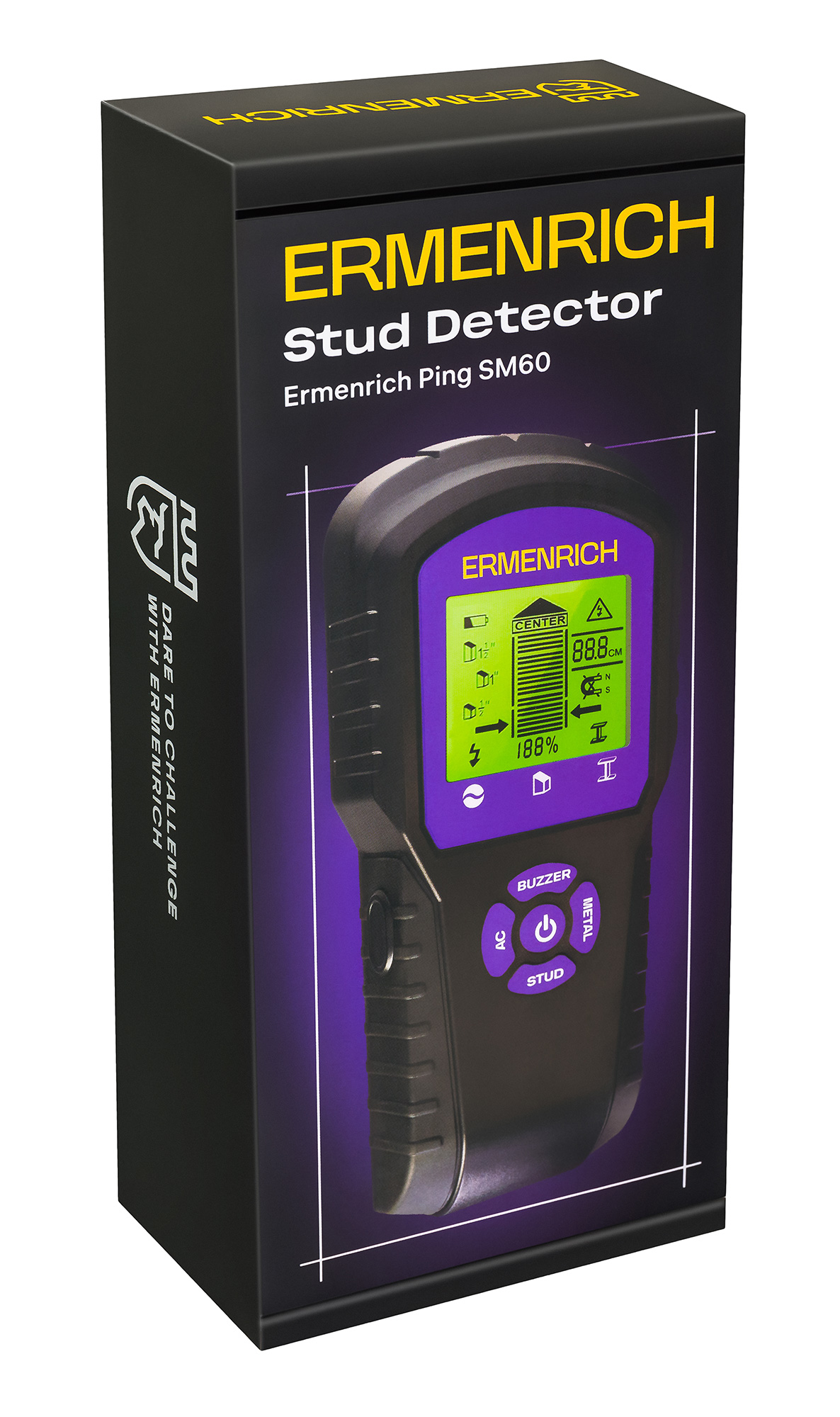 С помощью детектора проводки Ermenrich Ping SM60 можно легко и быстро обнаружить в стенах скрытые провода под током, а также арматуру и другие конструкции из металла и древесины. Это помогает определить оптимальное место для сверления отверстий и упрощает работу с перфоратором. Наличие детектора проводки – залог успешного выполнения работ по монтажу оборудования, ремонту помещений, установке розеток и мебели. Прибор отлично проявит себя и в домашнем хозяйстве, и в профессиональной сфере.