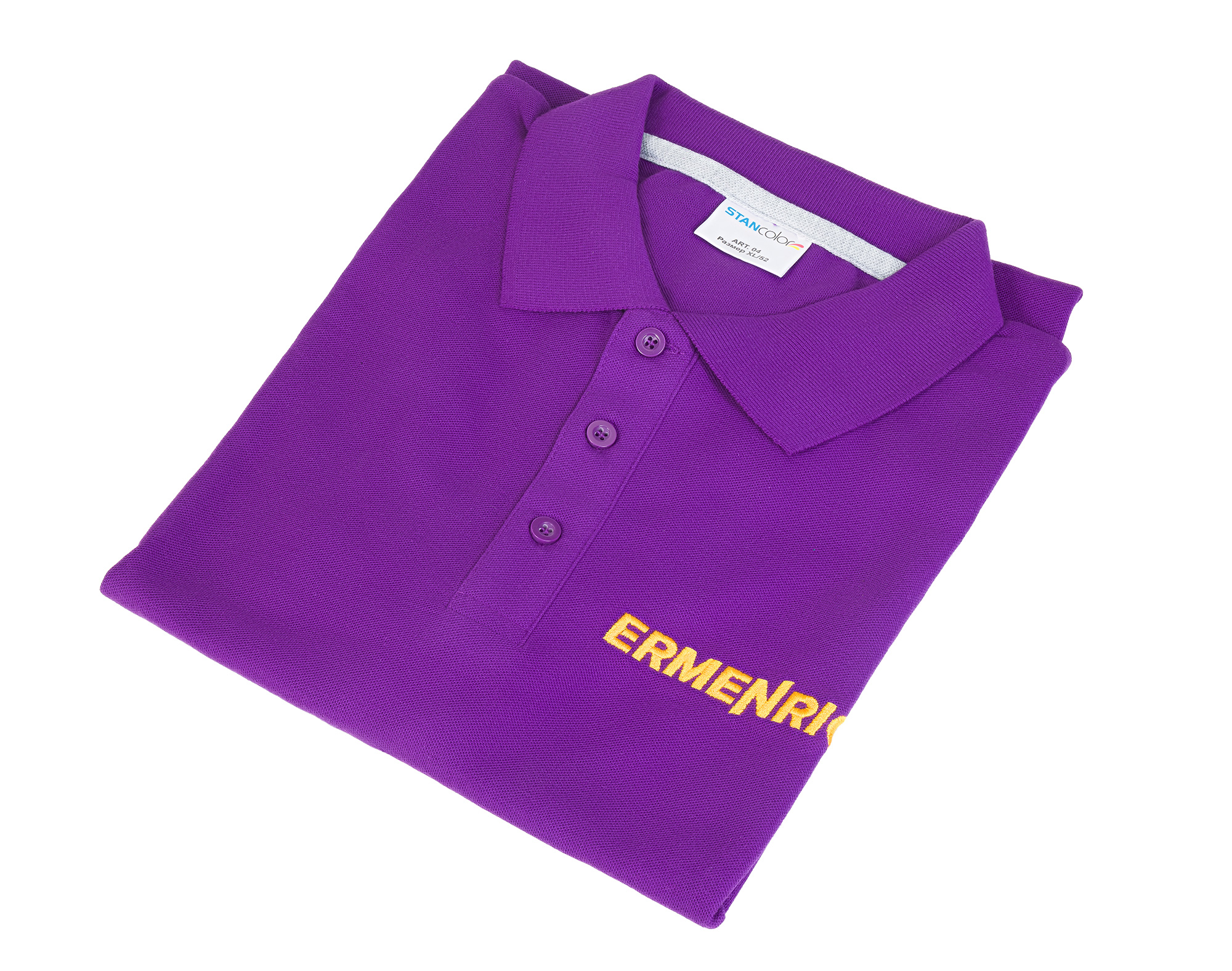Фирменная футболка-поло с вышивкой Ermenrich – это стильный повседневный аксессуар, который можно использовать как самостоятельный элемент гардероба или как часть рабочего костюма. Футболка отлично сидит на фигуре и не сковывает движений, а мягкий дышащий материал не раздражает кожу, обеспечивая комфорт носки в течение всего дня. Образ выгодно дополняют глубокий фиолетовый цвет ткани и желтая плотная вышивка в виде логотипа Ermenrich, расположенная на груди и на спине, в маленьком и крупном форматах соответственно.