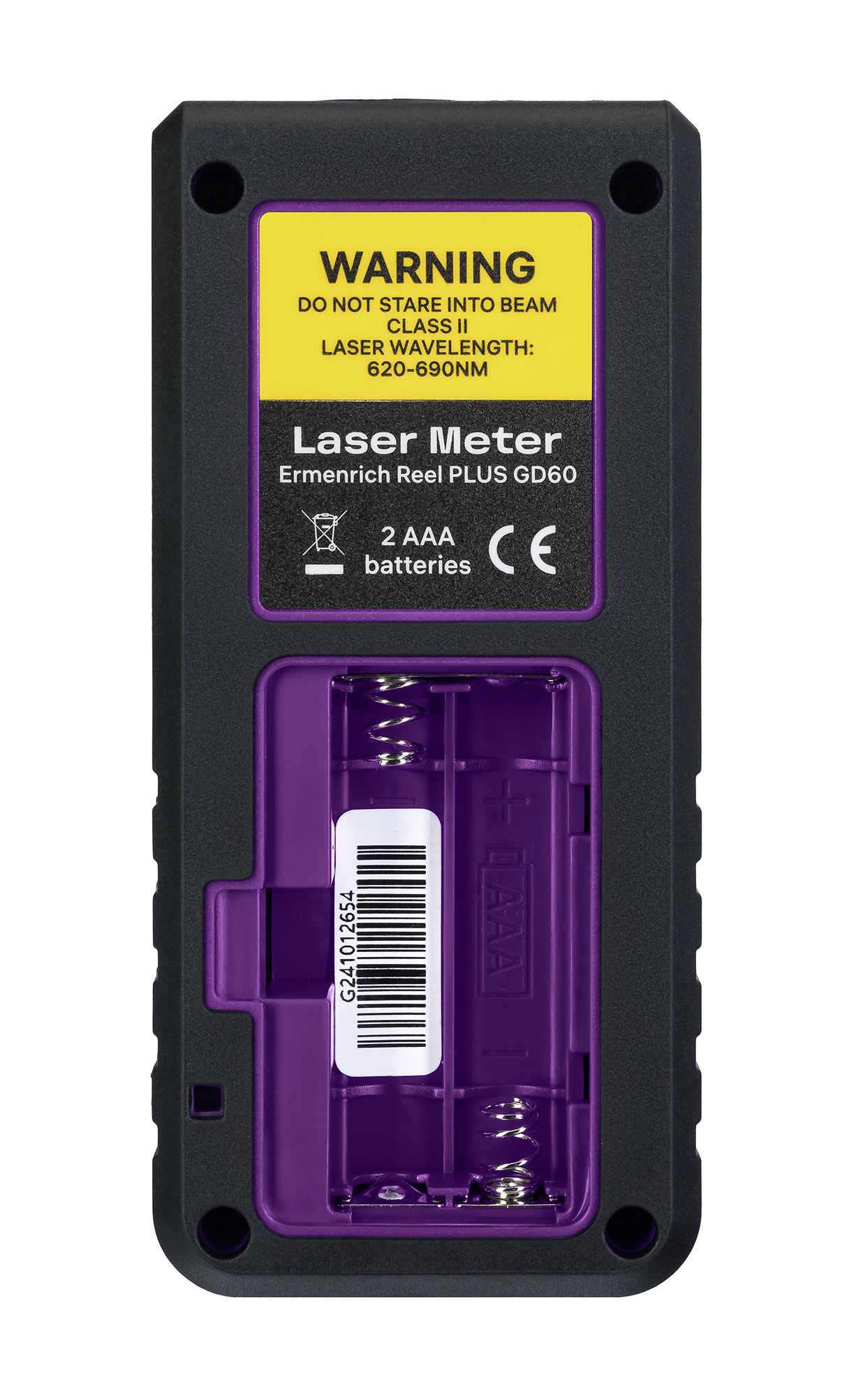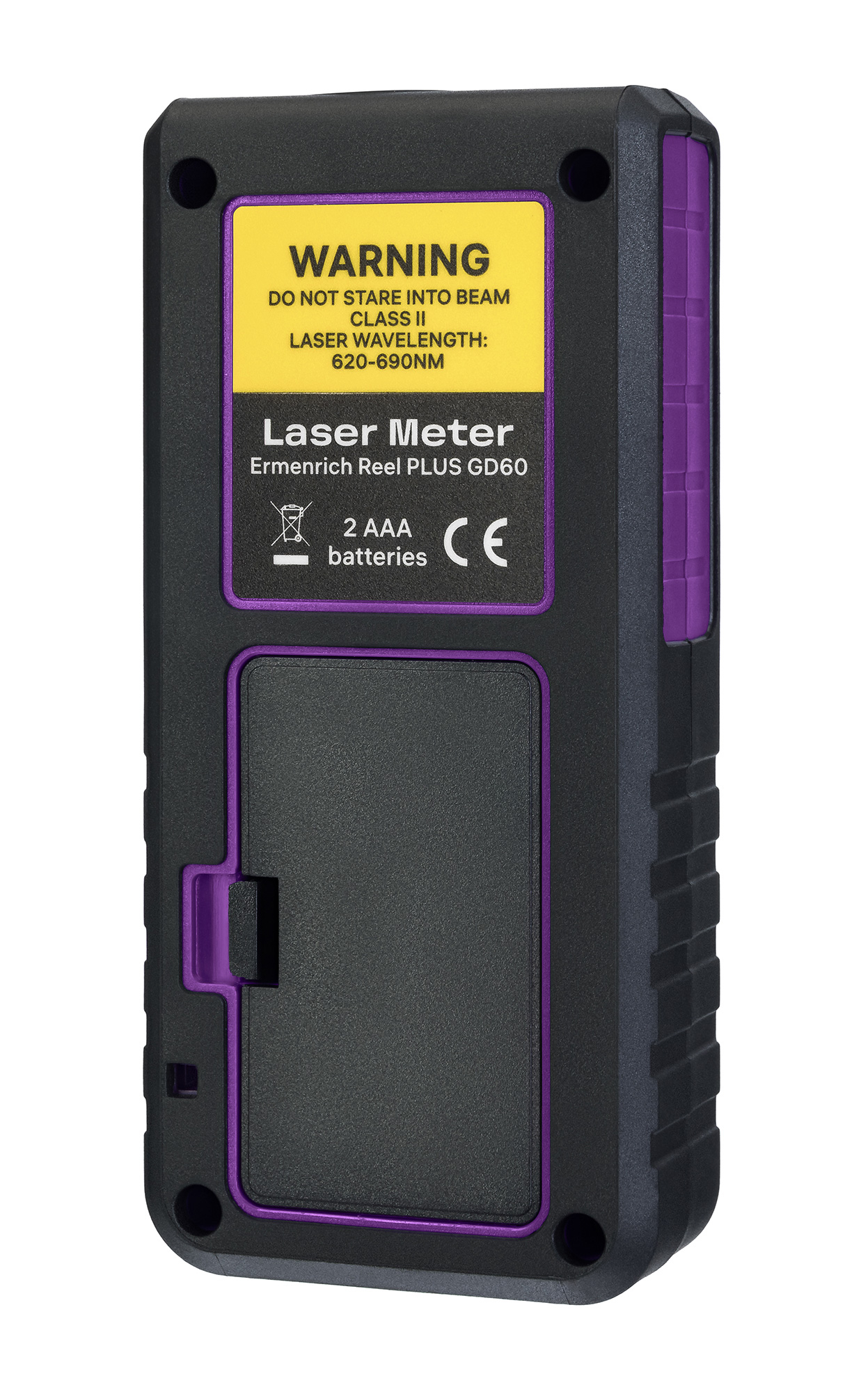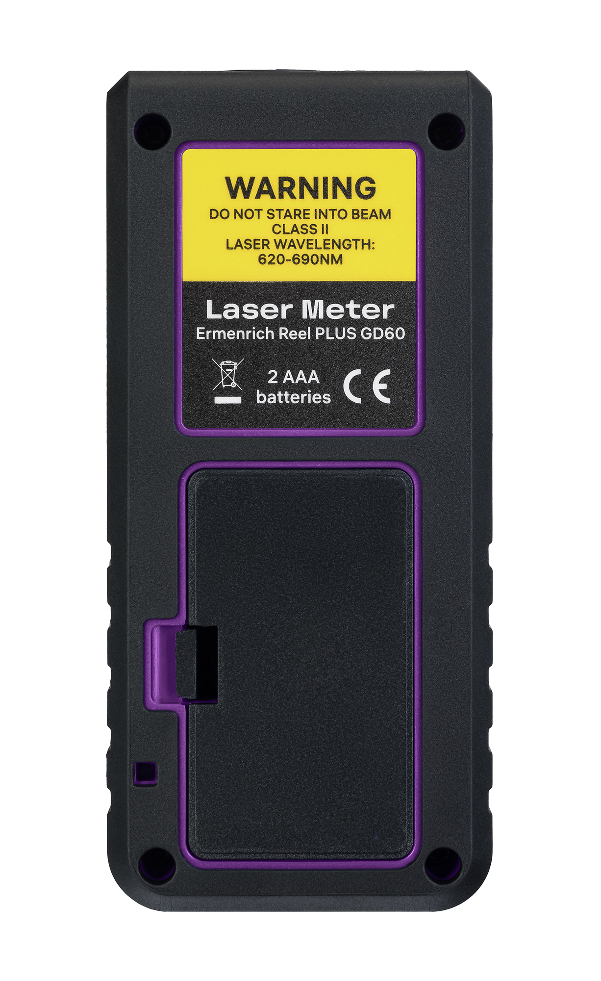 Измерения при помощи Ermenrich Reel GD60 проводятся в двух режимах: ручном (единичный замер) и автоматическом (сканирование). Компактное и легкое устройство удобно лежит в руке, для питания требуются 2 батарейки типа ААА. Звуковые сигналы при проведении замеров можно отключить, если они мешают работе. Для экономии заряда предусмотрено автоотключение как лазера, так и прибора в целом, и индикация низкого заряда батареек. Одного комплекта элементов питания достаточно, чтобы произвести более 5000 измерений.