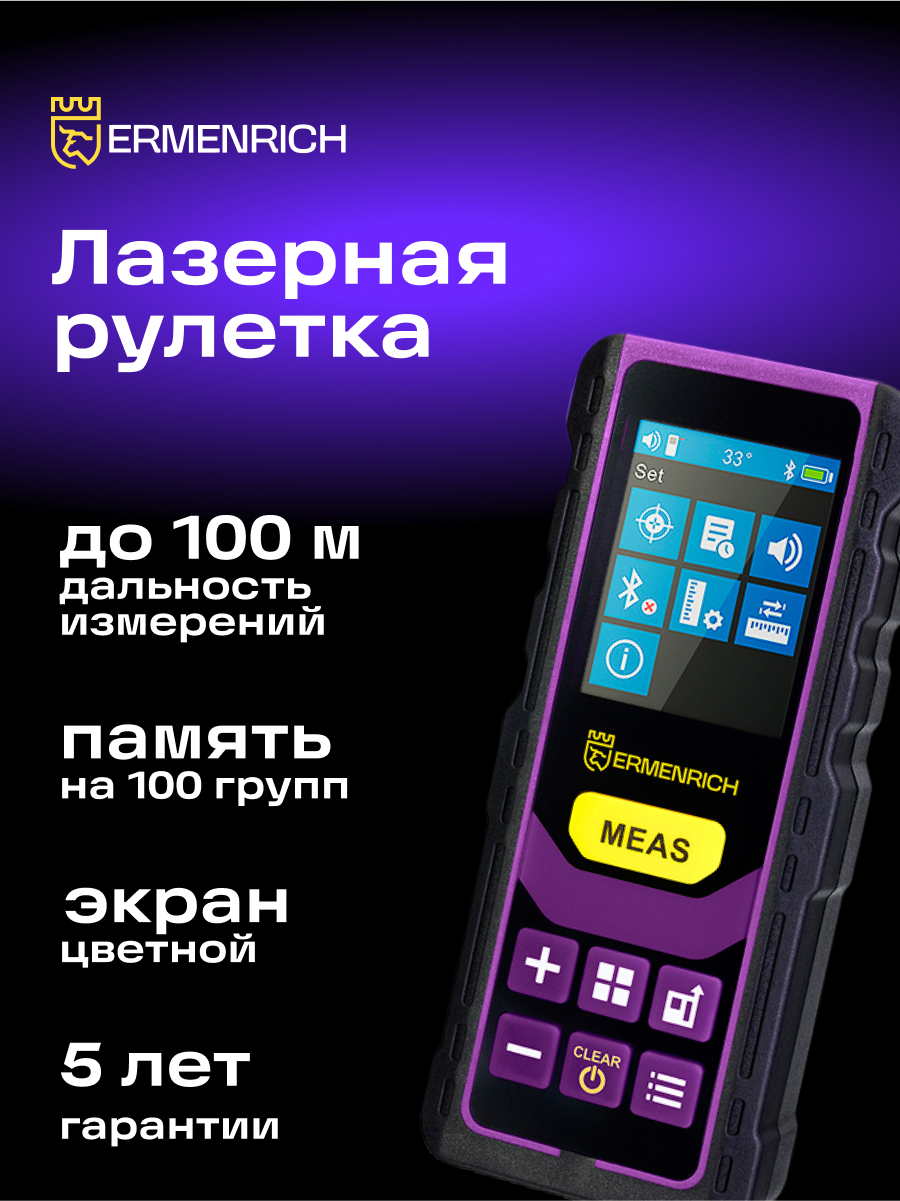 Лазерная рулетка Ermenrich Reel GL100 – это компактный инструмент для пространственных измерений всех видов: объема, площади, углов в пределах 0–180°, расстояний, вертикалей, длины. Кроме простых измерений, в приборе также предусмотрена функция «Пифагор», позволяющая косвенно определять расстояние между двумя точками через два промежуточных замера. Рулетка может работать как в режиме одиночного измерения, так и в режиме сканирования. Для повышения точности работы инструмента пользователю доступна настройка точки отсчета: ей может считаться как объектив рулетки, так и нижняя часть корпуса прибора. Ermenrich Reel GL100 предназначена для измерений в пределах 100 метров.