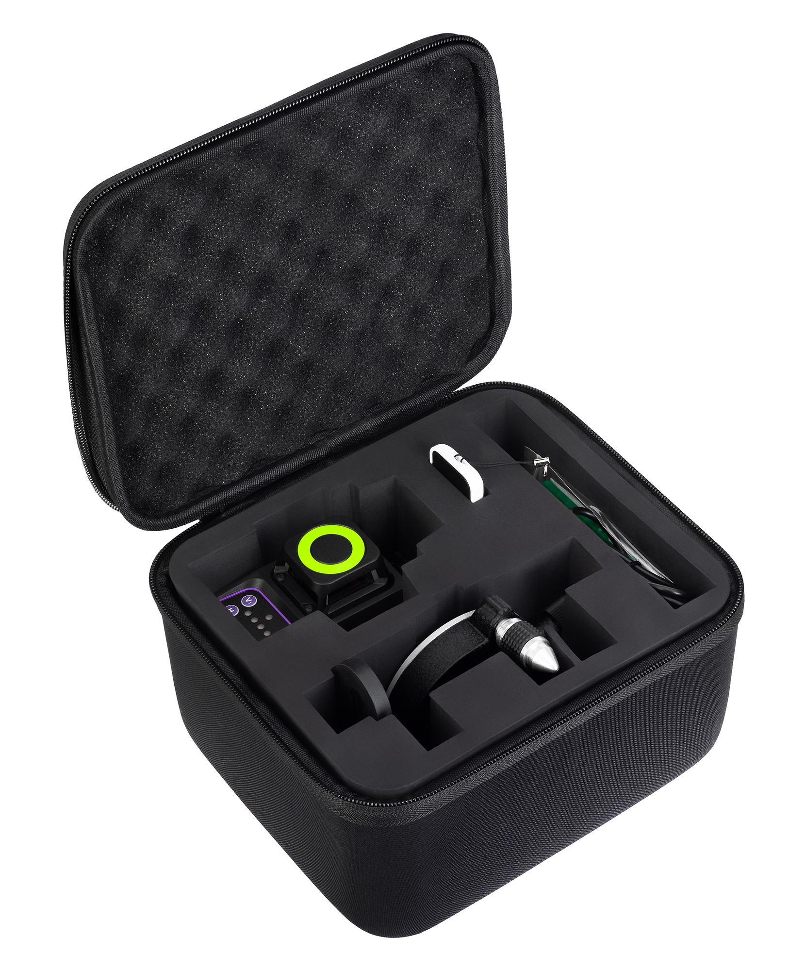 Лазерные светодиоды повышенной яркости формируют 12 линий зеленого цвета в режиме 3D, угол развертки лучей составляет 360 градусов по горизонтали и по вертикали. Благодаря большой дистанции работы получится эффективно выполнять разметку даже на обширной площади. Запускать прибор можно на расстоянии с помощью пульта дистанционного управления.