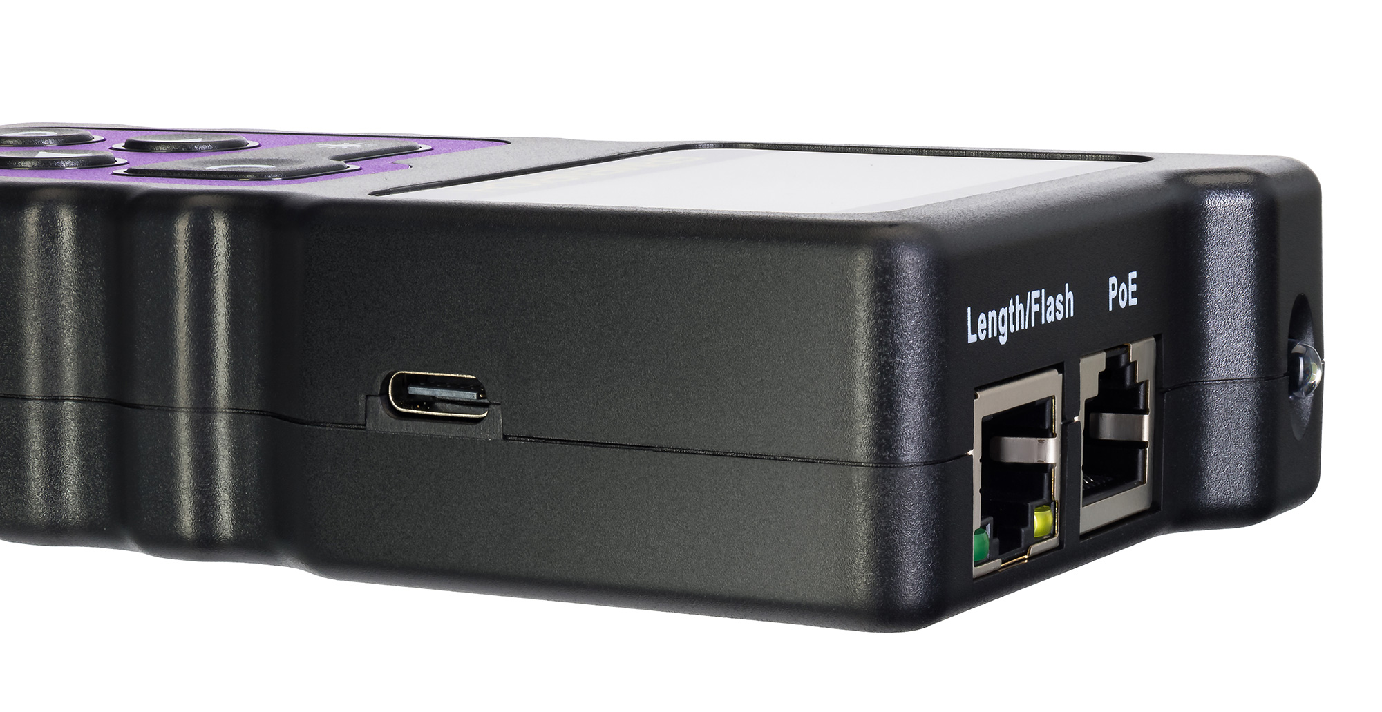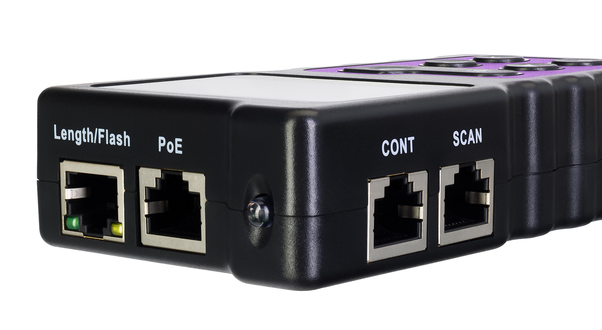 Для поиска кабеля по сетевому порту на коммутаторе или роутере может быть применен режим Port Flash (функция проблесковой индикации). Доступен тест PoE, в ходе которого можно выяснить и тип оборудования, и место его расположения (в конце или середине линии). Прибор также измеряет напряжение и определяет полярность. Приемник тестера можно перевести в режим NCV для бесконтактного определения опасного напряжения.