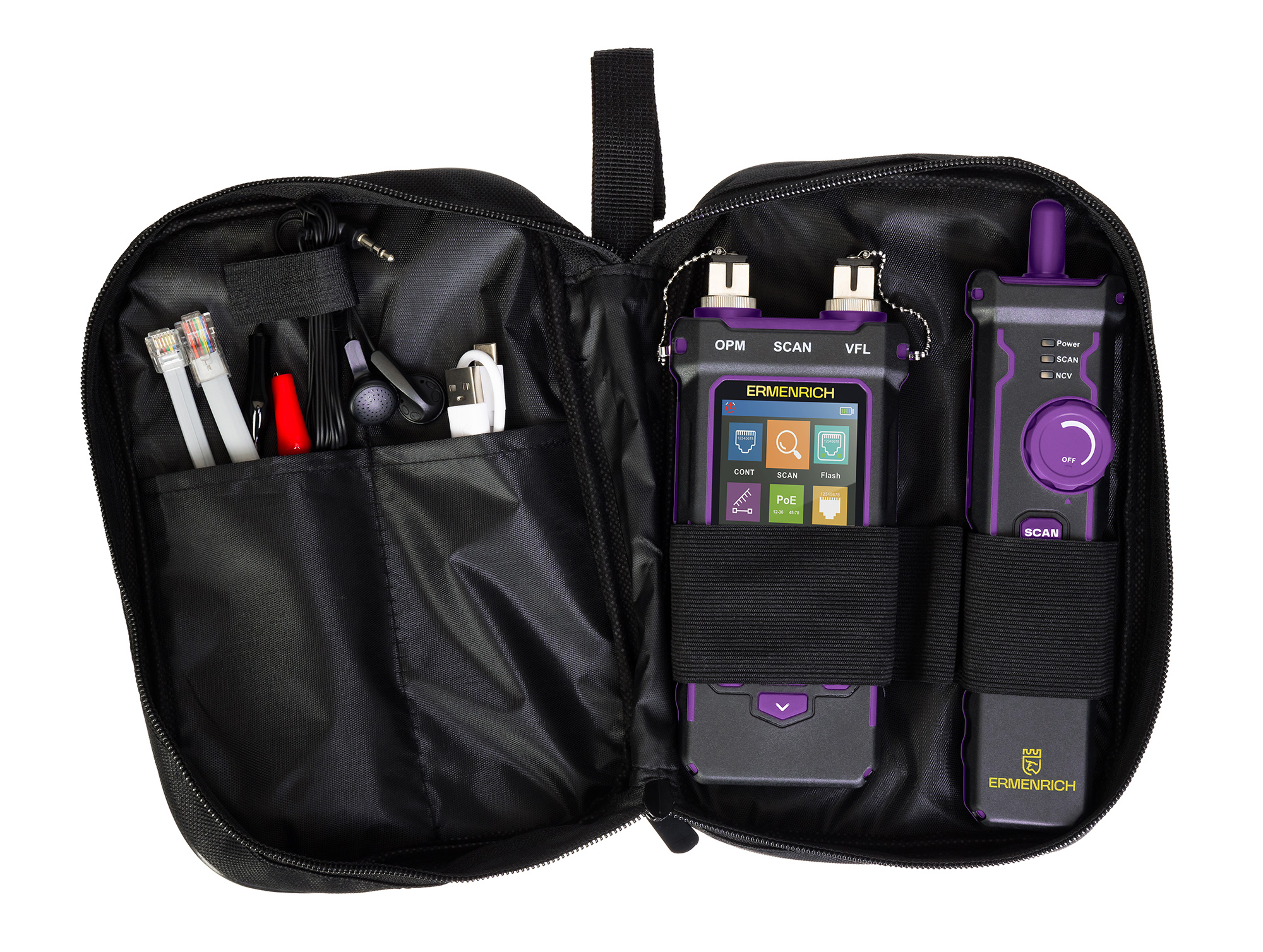 Ermenrich NetGeeks NP60 сочетает в себе функции кабельного тестера, измерителя длины кабеля и оптического мультиметра. Это отличный выбор для осуществления монтажа, диагностики и эксплуатации построенных на базе витых пар сетей, в том числе используемых для подключения к высокоскоростному интернету. Прибор пригодится для домашнего использования и станет востребованным инструментом у профессионалов. В режиме базового тестирования прибор показывает состояние кабельной линии: если где-то присутствует обрыв, перекрещенные пары или короткое замыкание, прибор об этом сообщит. При необходимости также можно провести проверку качества обжима коннектора витой пары. Выполнение теста PoE покажет не только наличие и величину напряжения, но также укажет на местоположение и тип питающего оборудования. Функция Port Flash позволяет быстро находить кабель, подключенный к роутеру или коммутатору, по индикации.