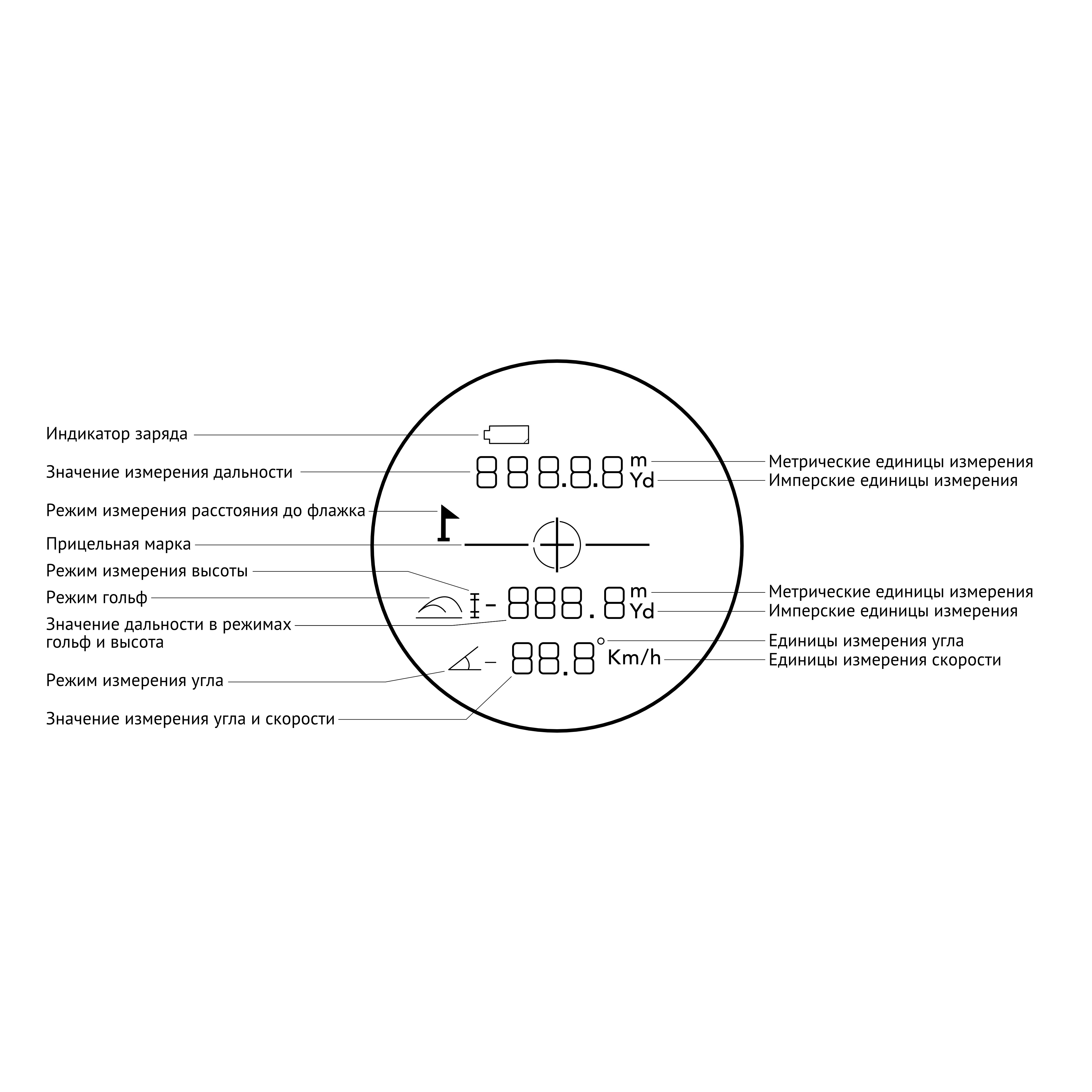 В дальномере предусмотрены два типа единиц измерения расстояния – ярды (Y) и М (метры). Длительное нажатие кнопки «MODE» изменяет единицы измерения.