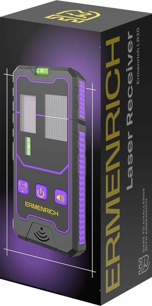 Ermenrich LR20 создан для оптимизации работы с лазерными уровнями и эффективен на удалении до 50 метров. Этот приемник совместим с приборами, оснащенными как зеленым, так и красным лазером. Принцип действия приемника весьма прост: при взаимодействии с лазером появляется сигнал световых и звуковых индикаторов, свидетельствующих о том, что нахождение луча определено. Для простоты и удобства пользования модель обладает крупным приемным окном и подсветкой экрана.