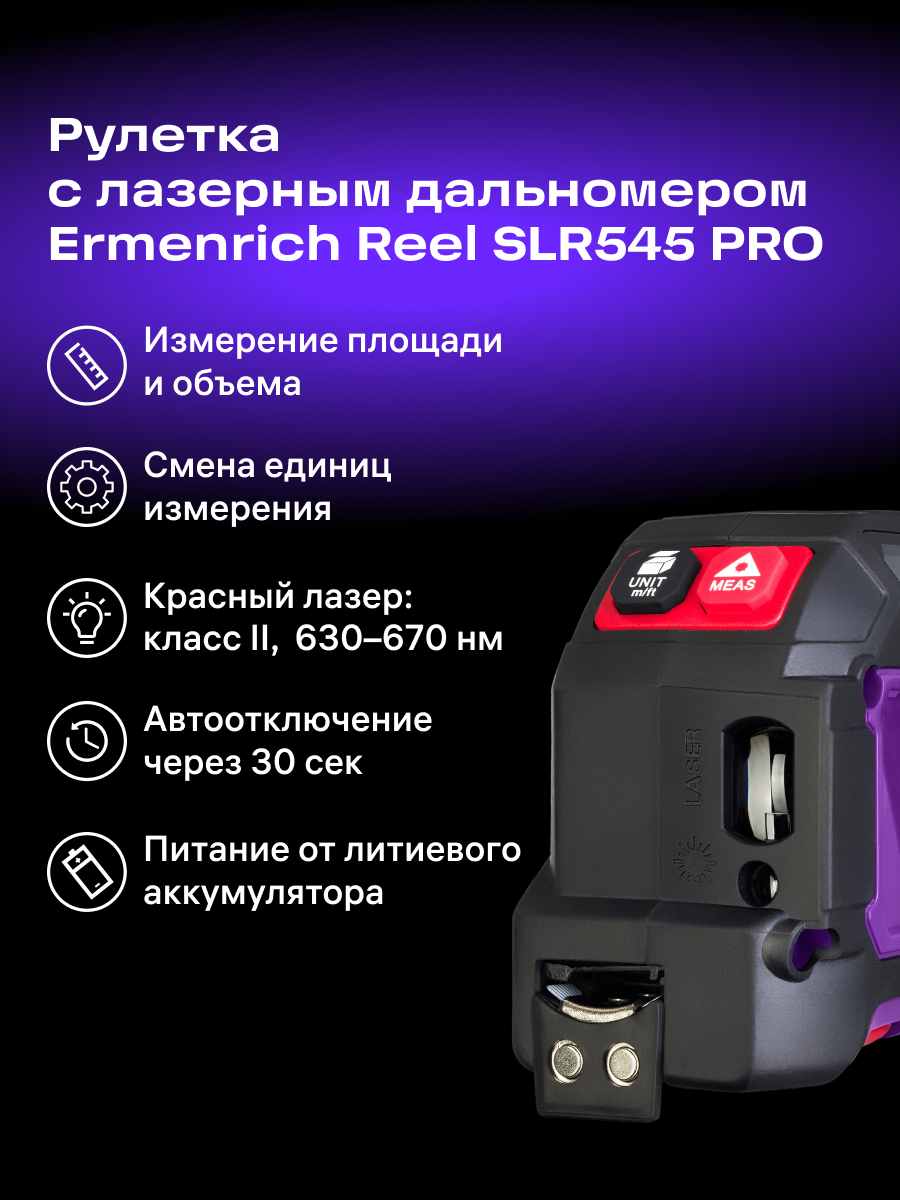 Ermenrich Reel SLR545 PRO – многофункциональный прибор, объединяющий в себе обычную и лазерную рулетки. Это позволяет производить точные замеры не только длины, но и других параметров – площади и объема. Рулетка отлично послужит при выполнении строительных, монтажных, ремонтно-отделочных работ разного профиля. Для удобства пользователя предусмотрено переключение единиц измерения. Также здесь есть функция автоотключения, которая помогает экономить заряд аккумулятора.