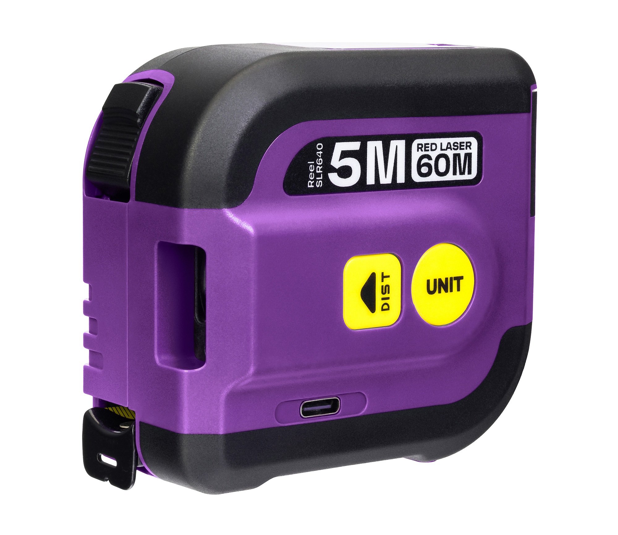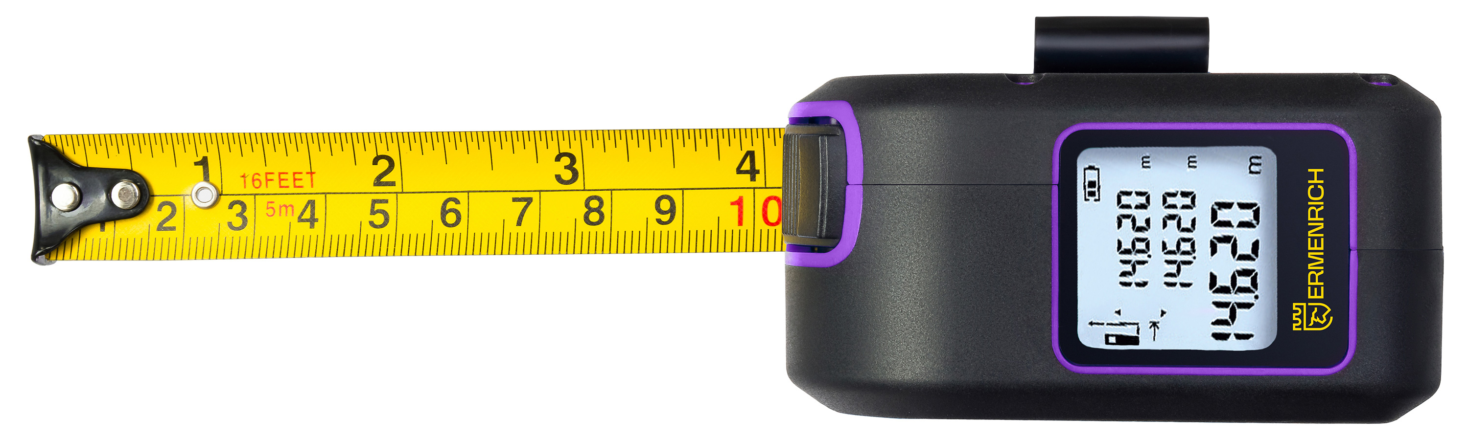 Лазерный дальномер служит для быстрых и высокоточных измерений на дистанции до 60 метров, а длина мерной ленты составляет 5 метров. Корпус прибора сделан из ABS-пластика, устойчивого к ударам и случайным повреждениям, и имеет защиту от брызг и пыли класса IP54. На торце расположен ЖК-экран с подсветкой. Также модель Ermenrich Reel SLR640 имеет функцию голосового оповещения: если ее активировать, рулетка будет озвучивать результаты измерений.
