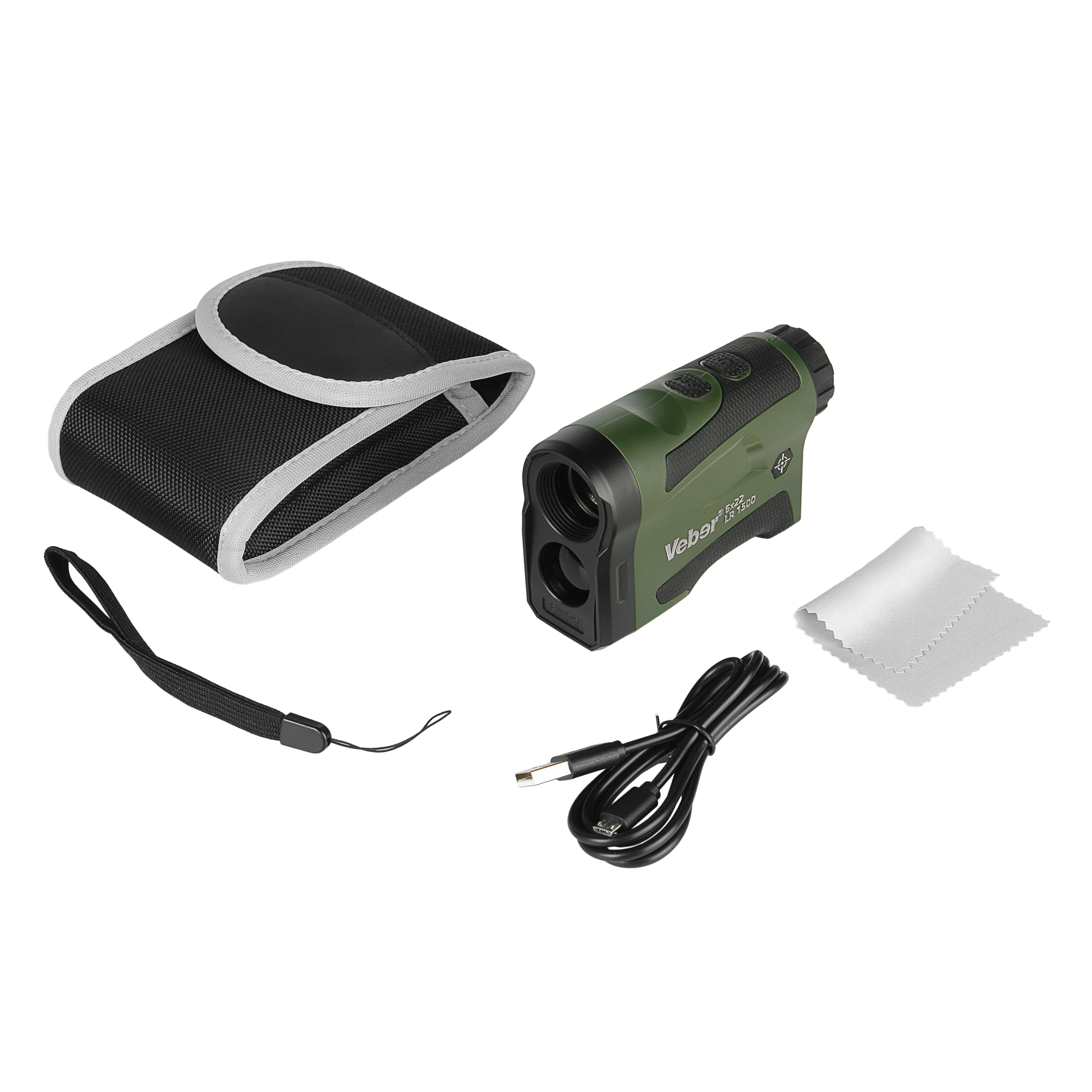 Лазерный дальномер Veber 6x22 LR 1500 поставляется в плотном и прочном текстильном чехле с карабином для ношения на поясе, в комплекте – кистевой ремешок.