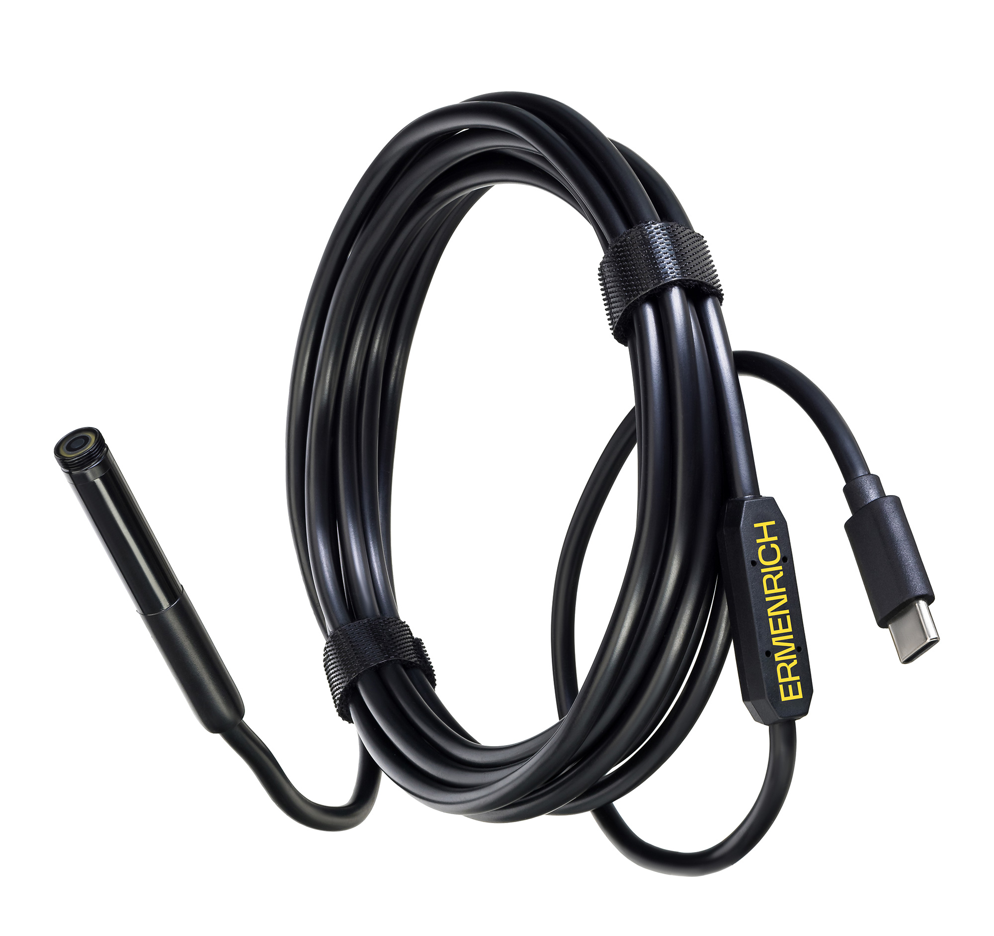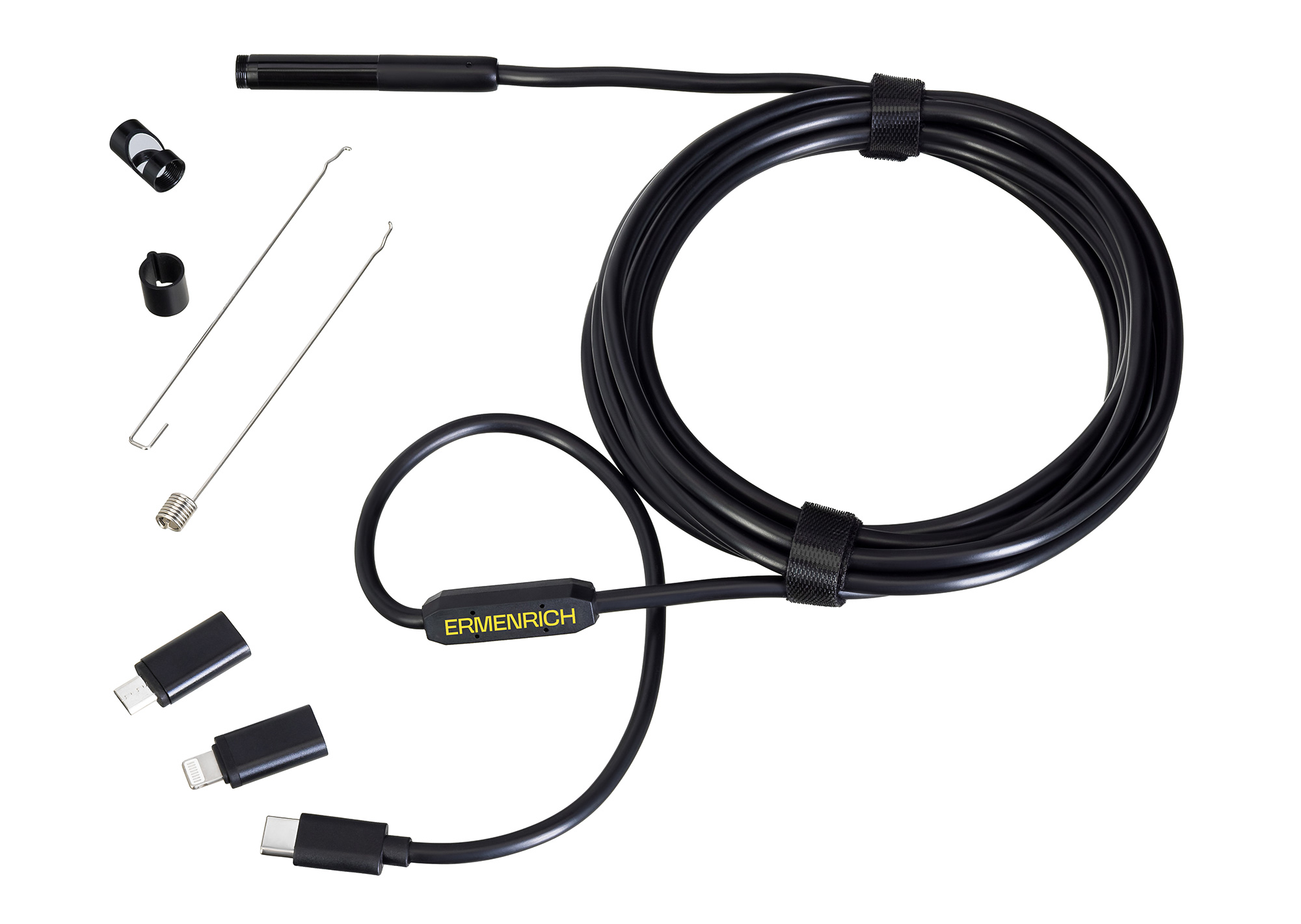 Видеоэндоскоп Ermenrich Seek VE10 – это устройство, позволяющее контролировать качество ремонта и правильность монтажа коммуникаций в помещении даже в самых труднодоступных местах. Инструмент оснащен камерой с общим диаметром 7,9 мм, расположенной на конце гибкого кабеля длиной 3 метра. При помощи тонкого и подвижного зонда пользователь сможет быстро и успешно оценить состояние скрытых пустот в стенах, найти засоры в трубах и дренажных системах, обнаружить протечки, выявить причины сырости, очаги плесени, источники промерзания и многое другое. Угол обзора камеры – 70°. Вокруг нее также расположены 8 ярких светодиодов для удобного исследования темных застенных участков, куда не проникает никакой свет. За формирование изображения отвечает качественная CMOS-матрица.