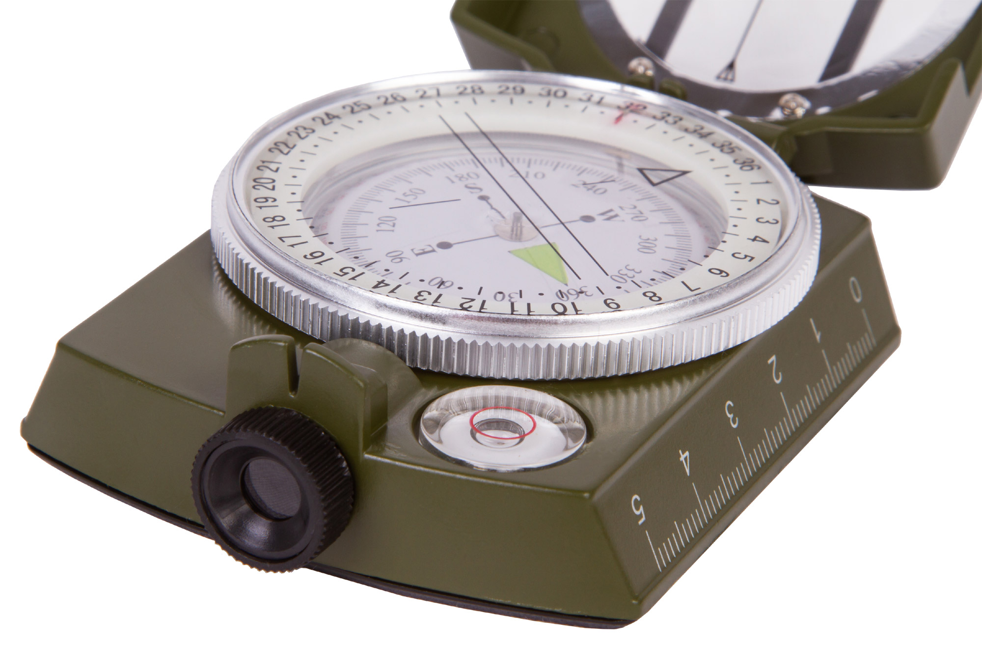 Прибором легко пользоваться в закрытом и отрытом состоянии благодаря складной конструкции, наличию прозрачного защищенного окна на внешней крышке изделия. Базовый циферблат компаса погружен в стабилизирующую жидкость, ускоряющую замедление магнитной стрелки при первичном позиционировании и выборе направления магнитного полюса. Пызырьковый уровень позволяет выровнять устройство по горизонтали.