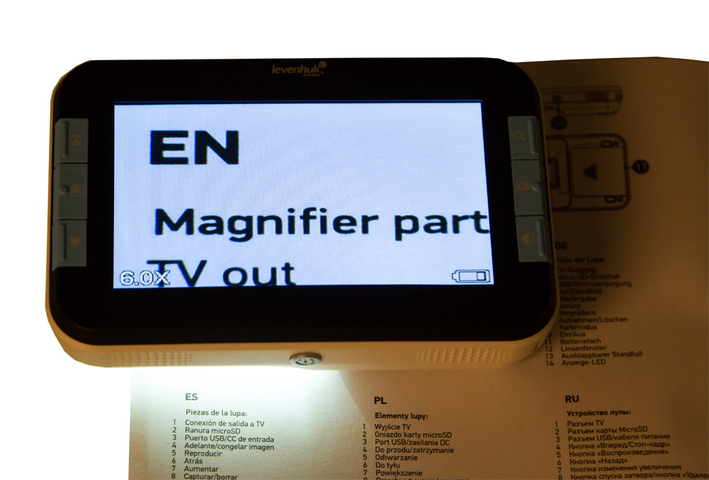 Основа устройства – это качественные линзы, не дающие искажений, а также ПЗС-матрица из светочувствительных фотодиодов. Последняя преобразует световой поток в электрозаряд и формирует цифровое изображение, сразу транслирующееся на экран 4.3 дюйма в режиме реального времени. Прибор поддерживает диапазон увеличения от 6 до 14 крат без потери качества изображения, позволяет делать фотографии и сохранять их на опциональную карту памяти microSD ёмкостью до 64 ГБ.